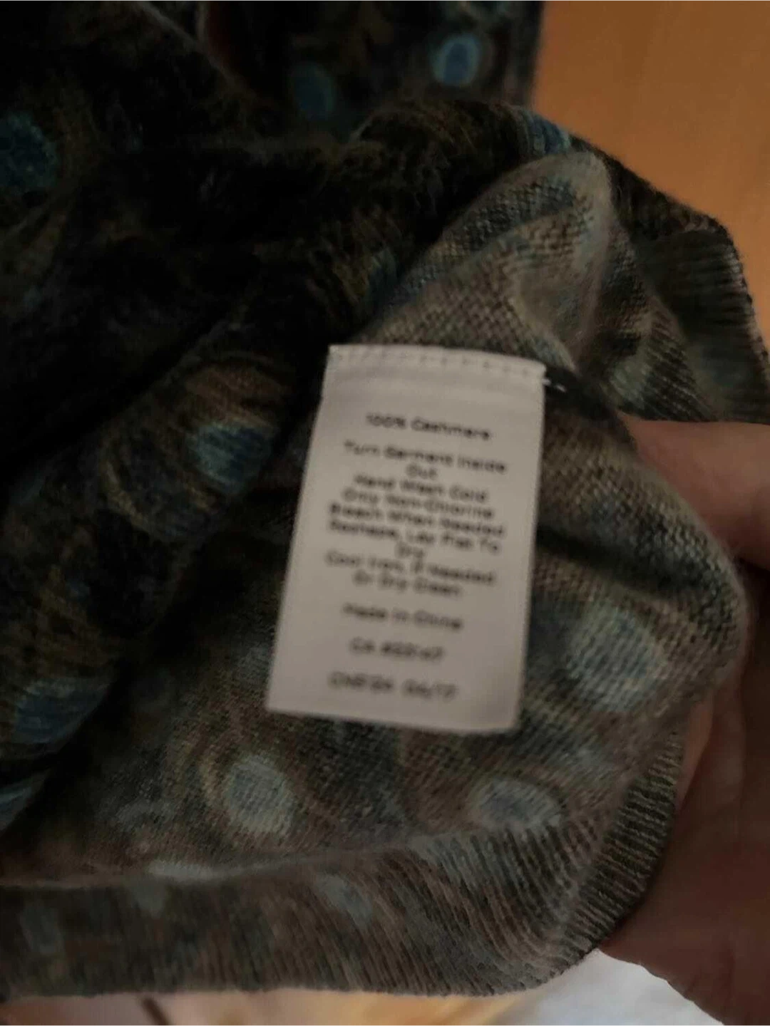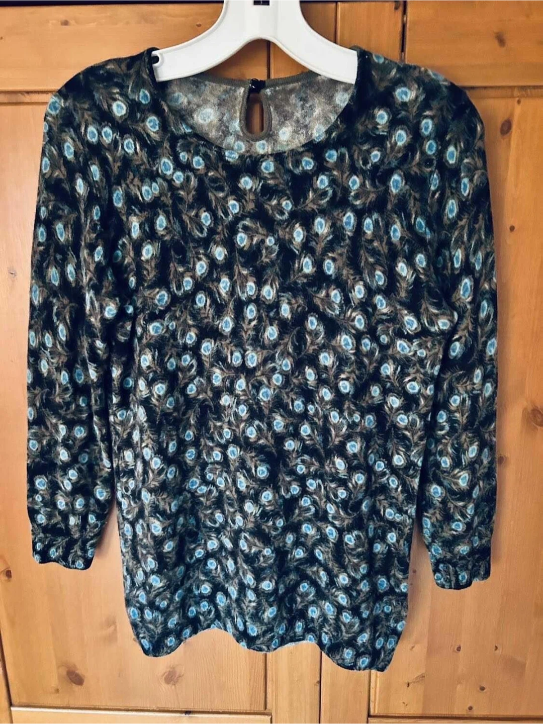 This sweater is made from 100% cashmere. It features a beautiful peacock feather print throughout. Hand wash cold, lay flat to dry.