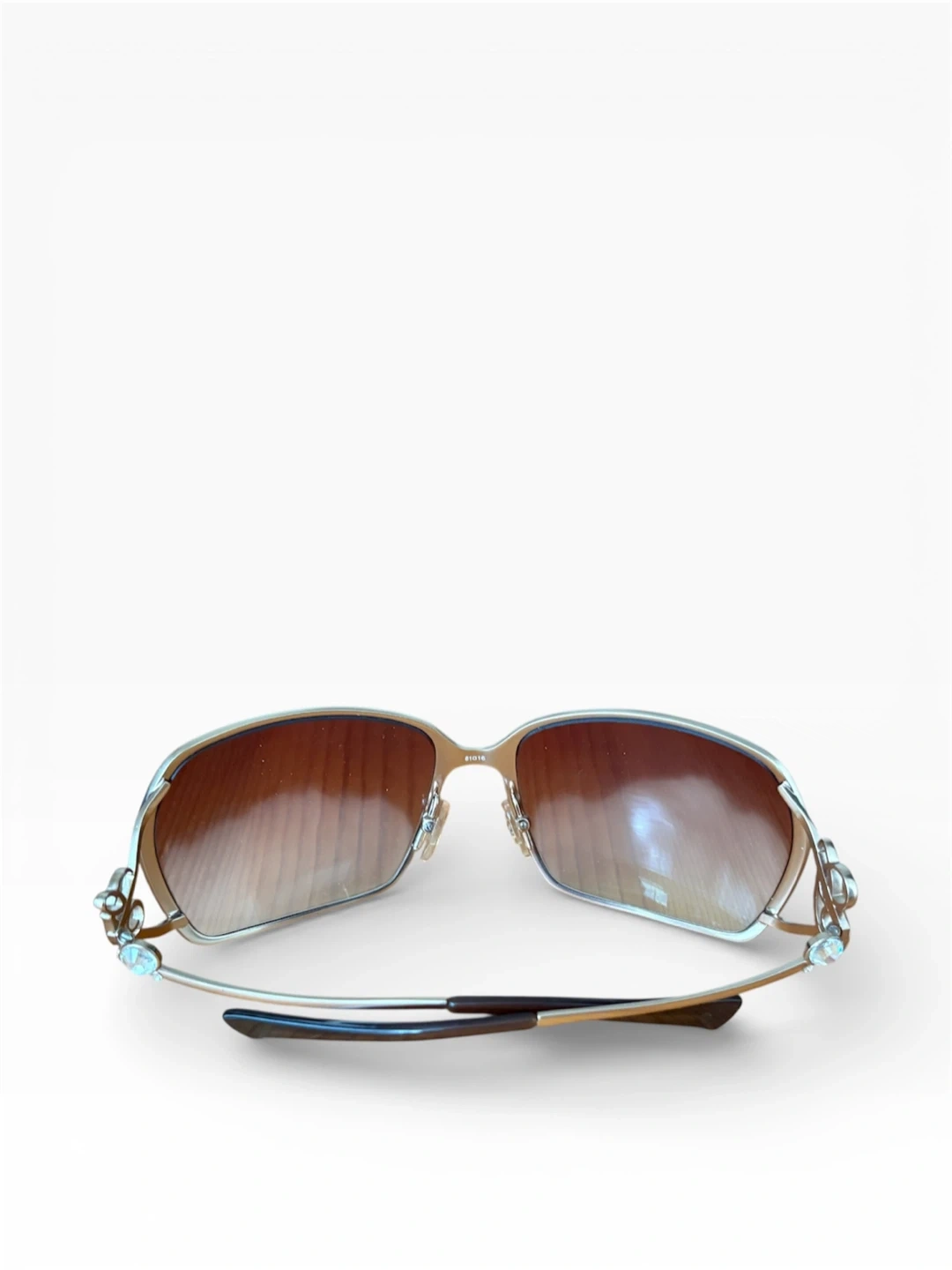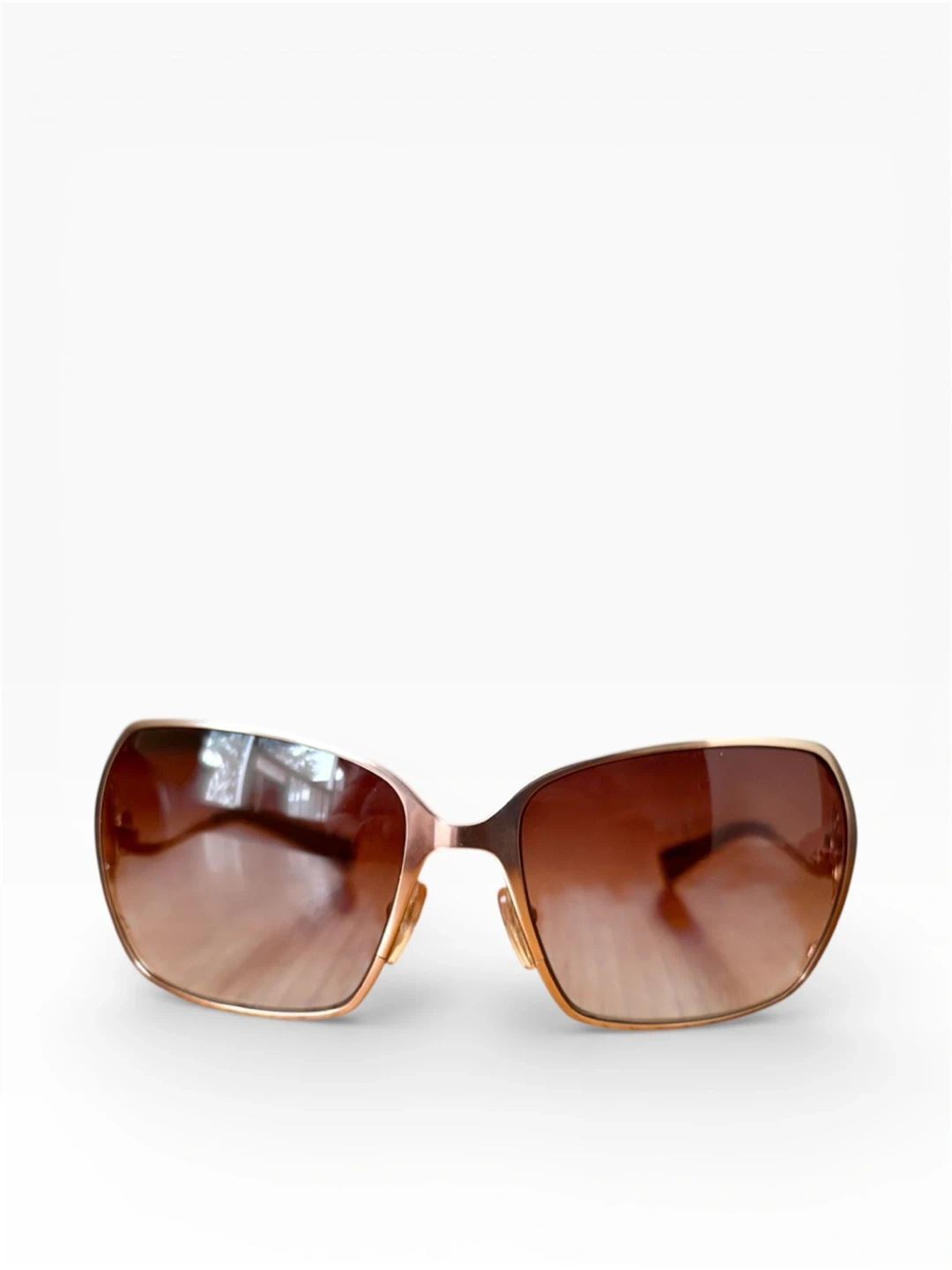 Never worn!! I’ve had these a good while, and don’t even remember buying them lol! I found them in the back of my closet and have never worn them whatsoever! Gradient brown lenses and light gold (with mixed-metal silver/gold/crystql side embellishments) coloured metal frames.