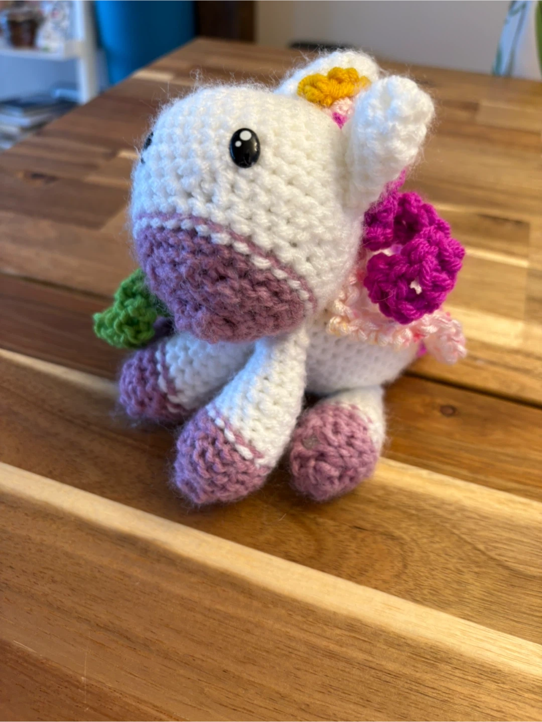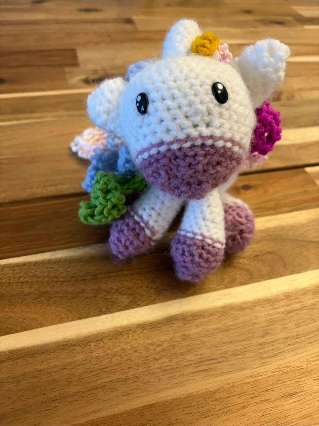 This adorable white amigurumi unicorn is lovingly hand-crocheted. It features purple accents on its muzzle and feet, with colourful floral details on its mane and tail. It's a sweet, huggable friend for any fan of mythical creatures!