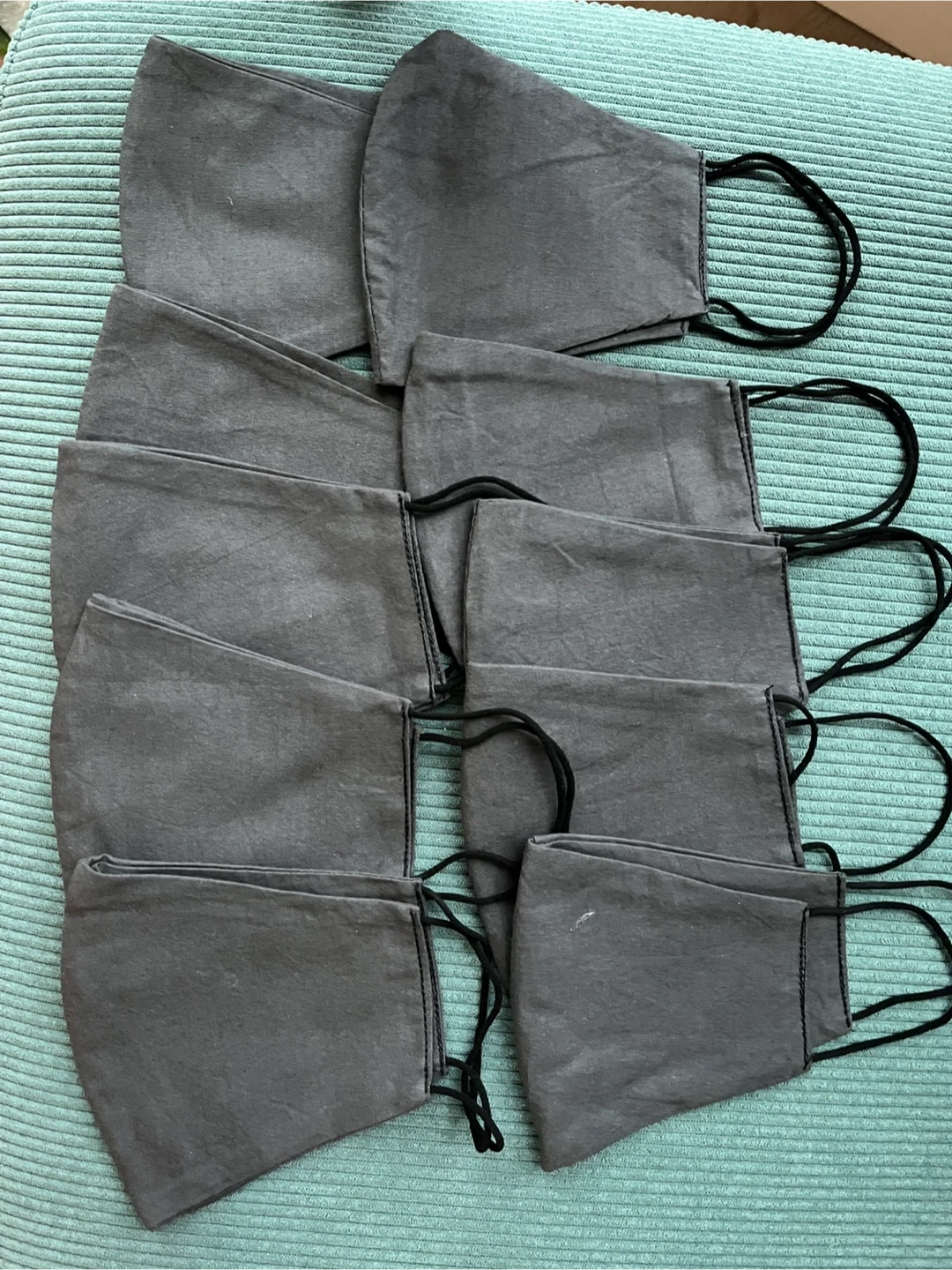 A pack of 10 grey cloth face masks. Handmade. These masks are made from a breathable cotton fabric. New. Best for women and children.