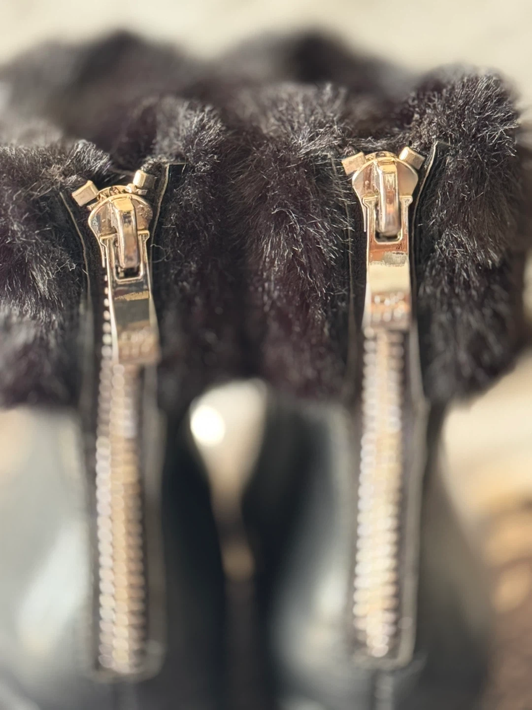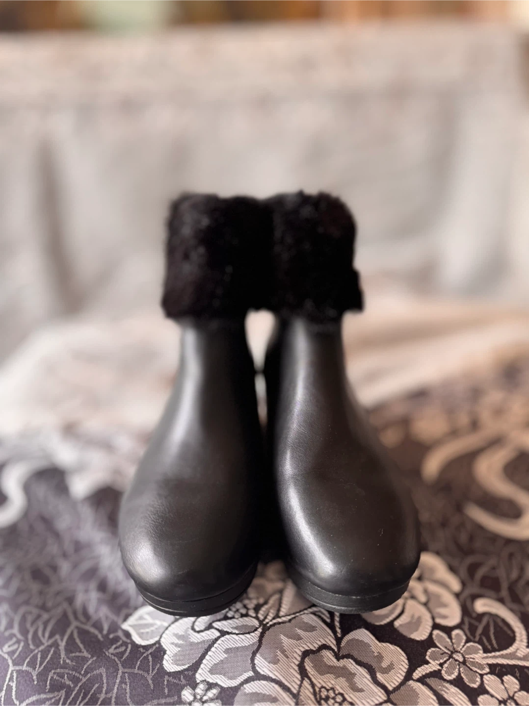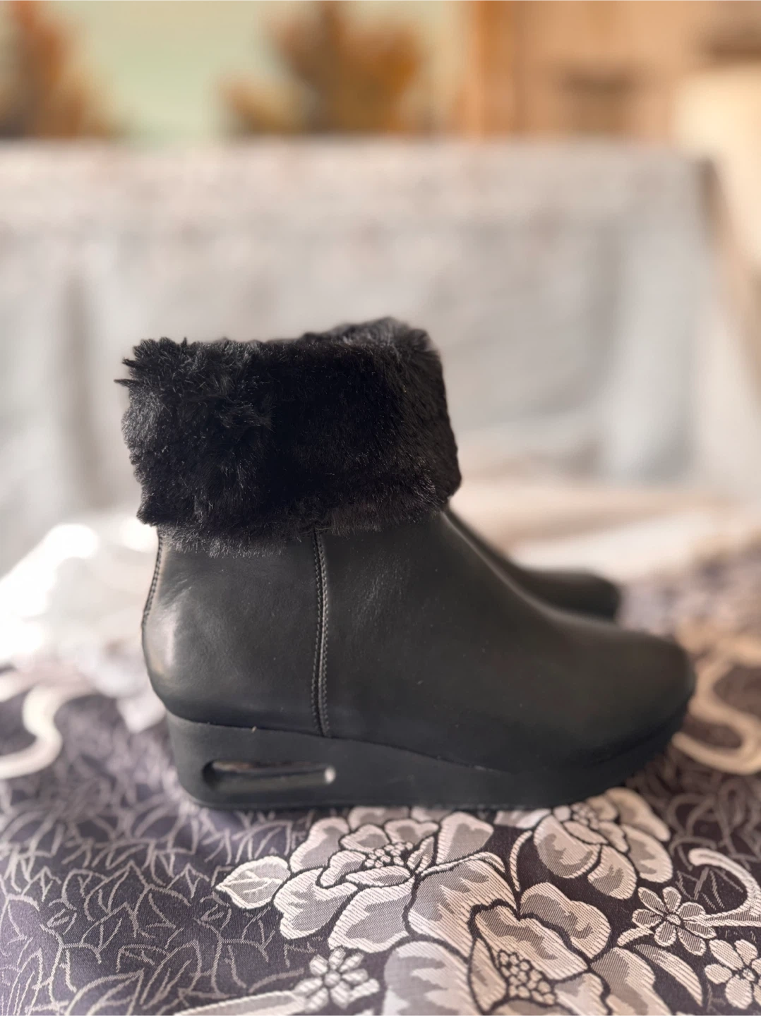 Stylish black ankle boots featuring a cozy fur trim and decorative back zippers. The faux leather upper and comfortable wedge heel make them a great choice for everyday wear.