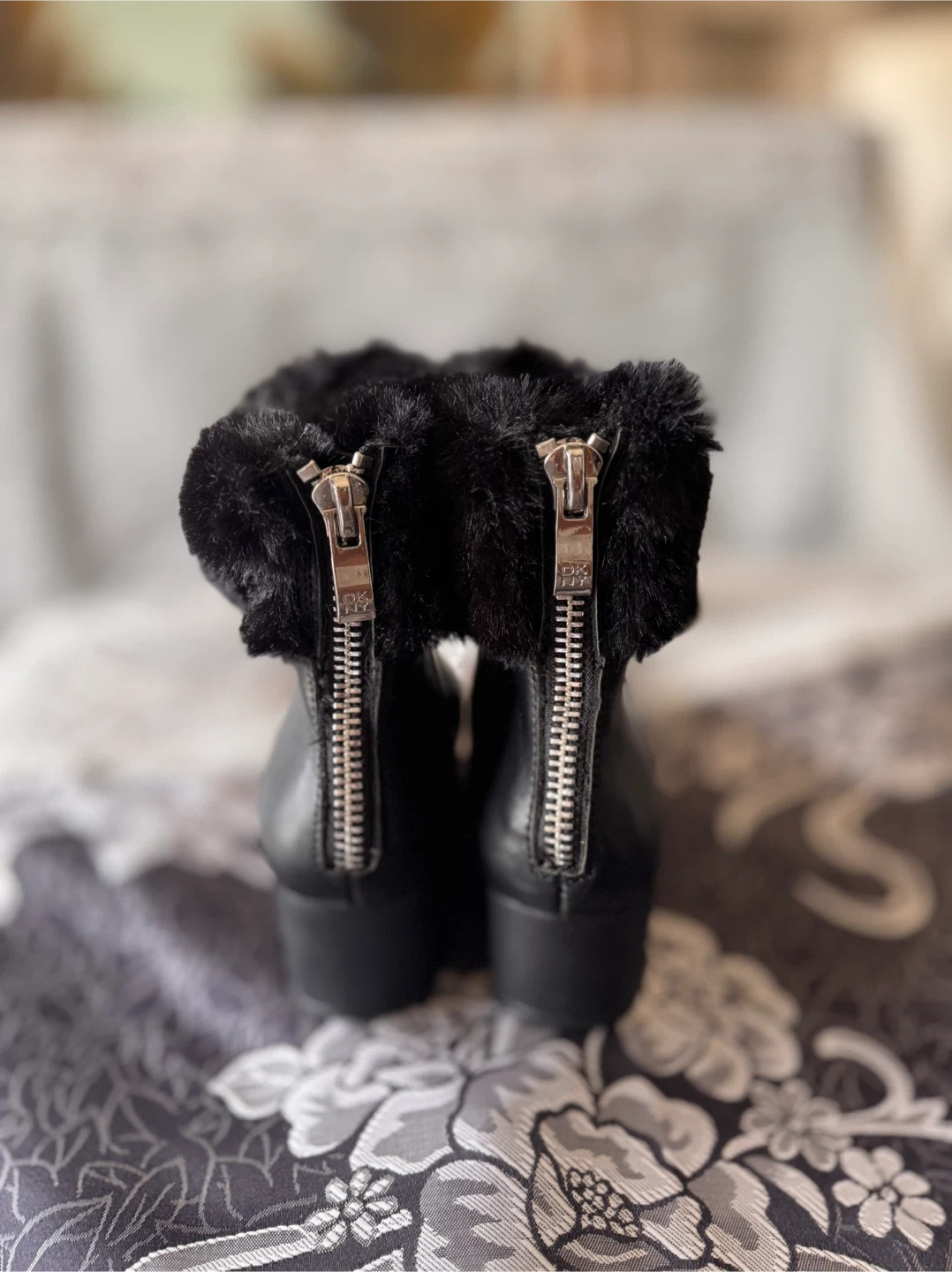 DKNY Black Ankle Boots with Fur Trim and Zippers