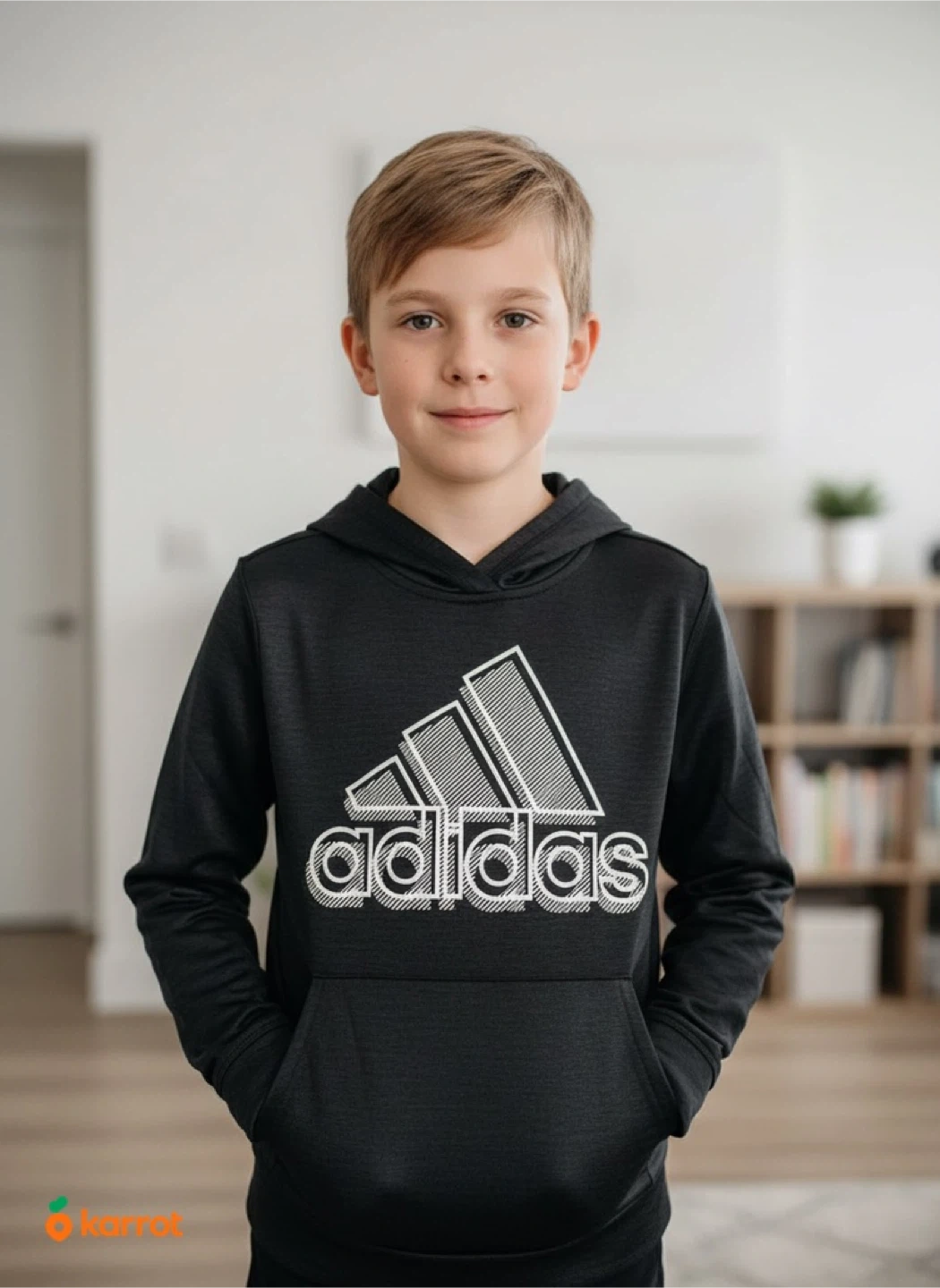 This black Adidas hoodie features the iconic logo. It's made from 100% polyester material and is a youth large size (14/16). A comfy and sporty pullover!