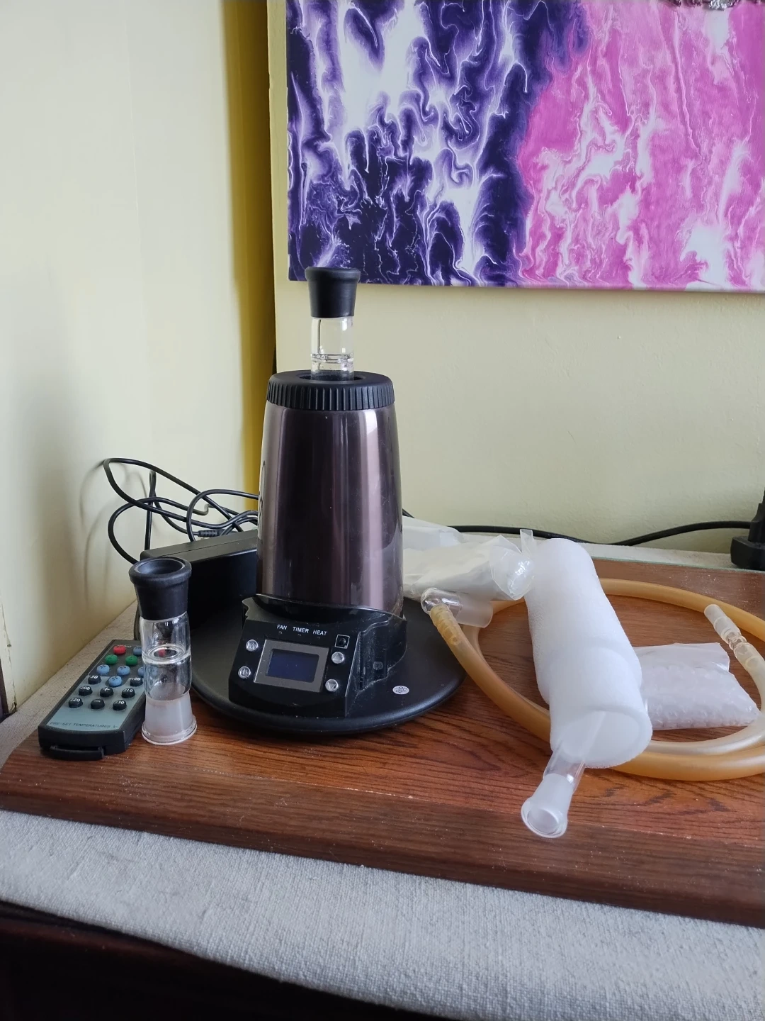 This is the Arizer Extreme Q multi-purpose hot air machine. It functions as a vaporizer, aromatherapy device, essential oils diffuser, and potpourri warmer. Includes remote control, manual, and various accessories.
