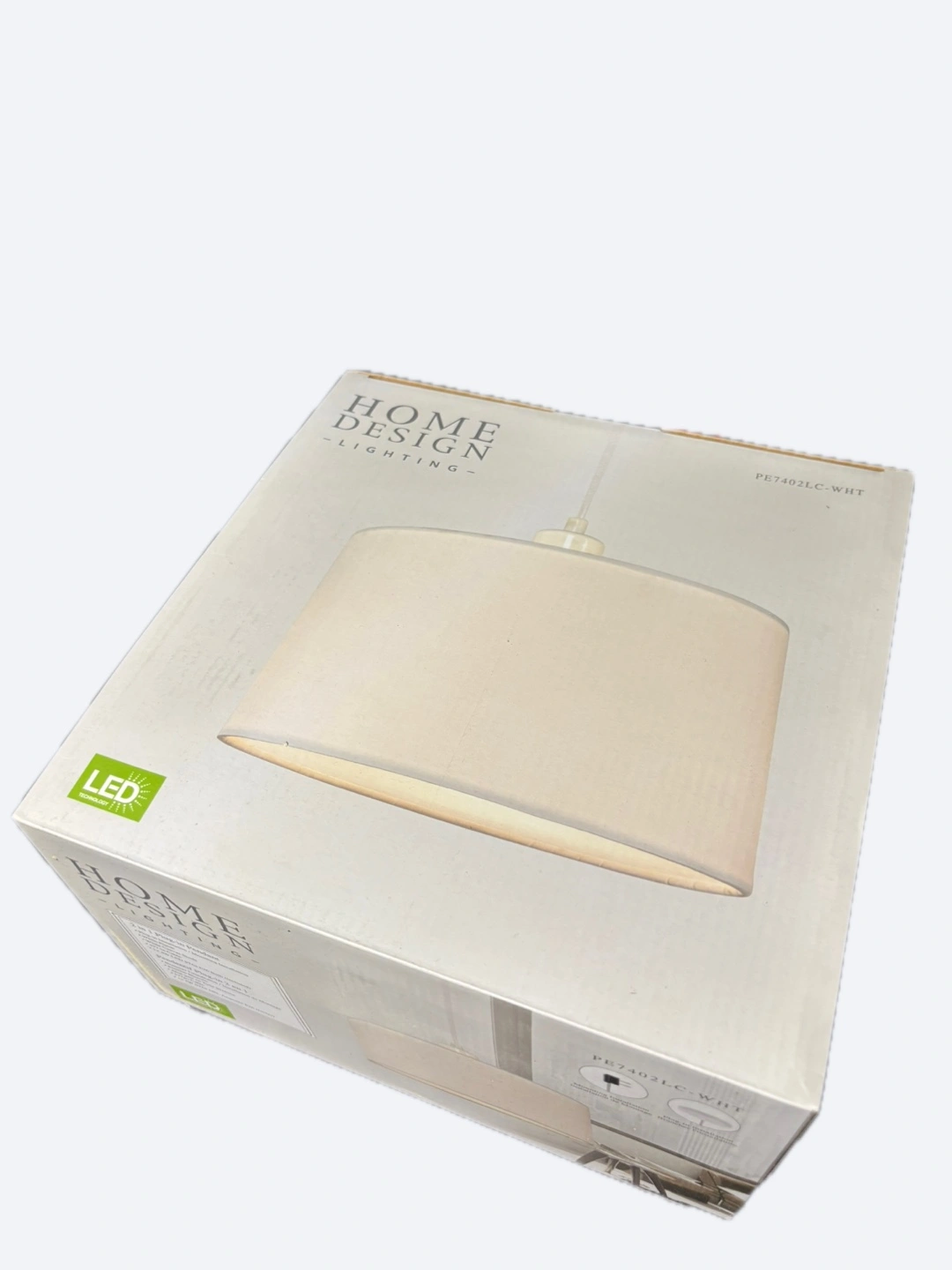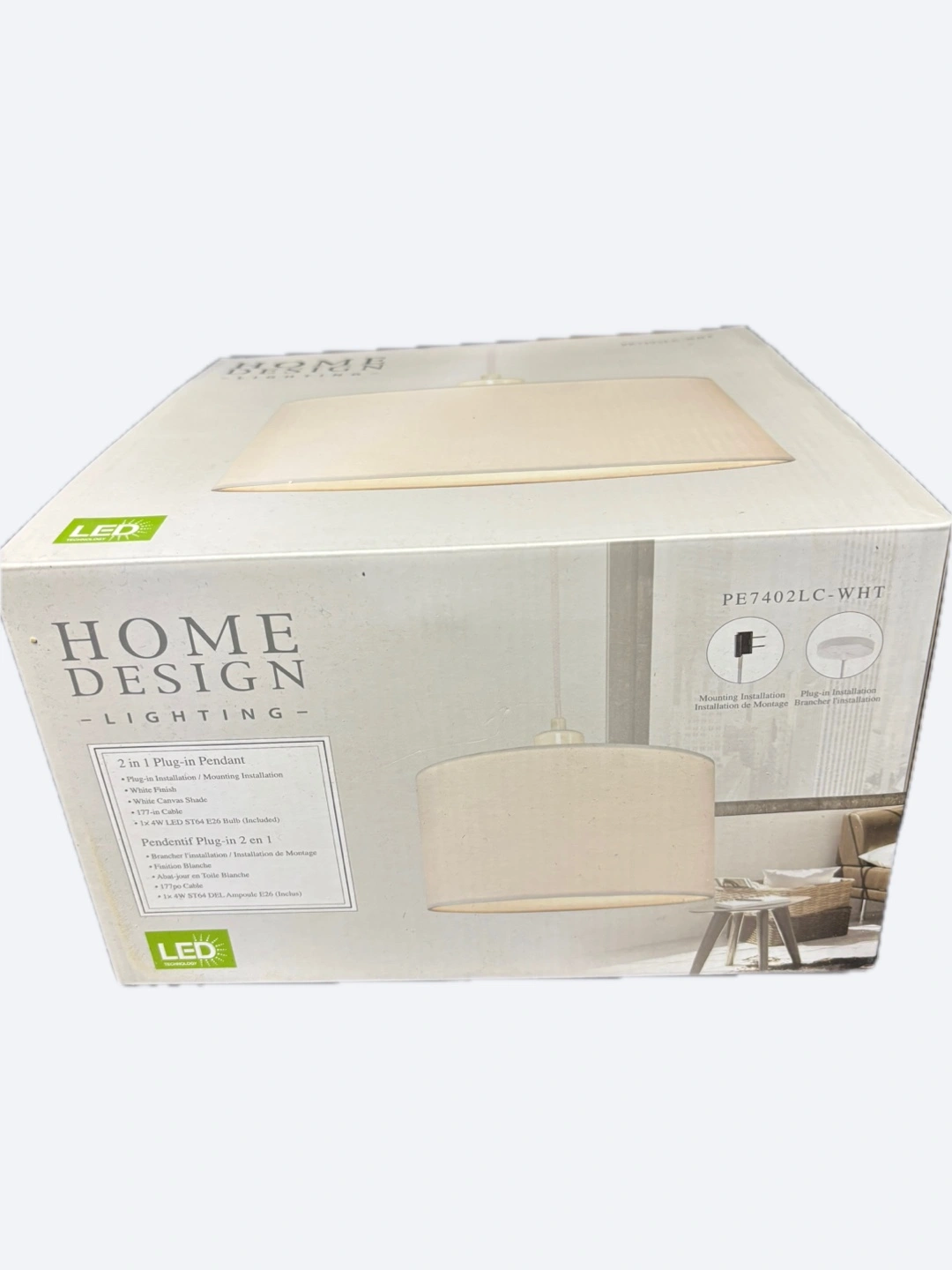 This is a Home Design Lighting 2 in 1 plug-in pendant. It features a white cotton shade and includes a 12W LED E26 bulb. The cord is 197 inches long. It's designed for plug-in installation or mounting.