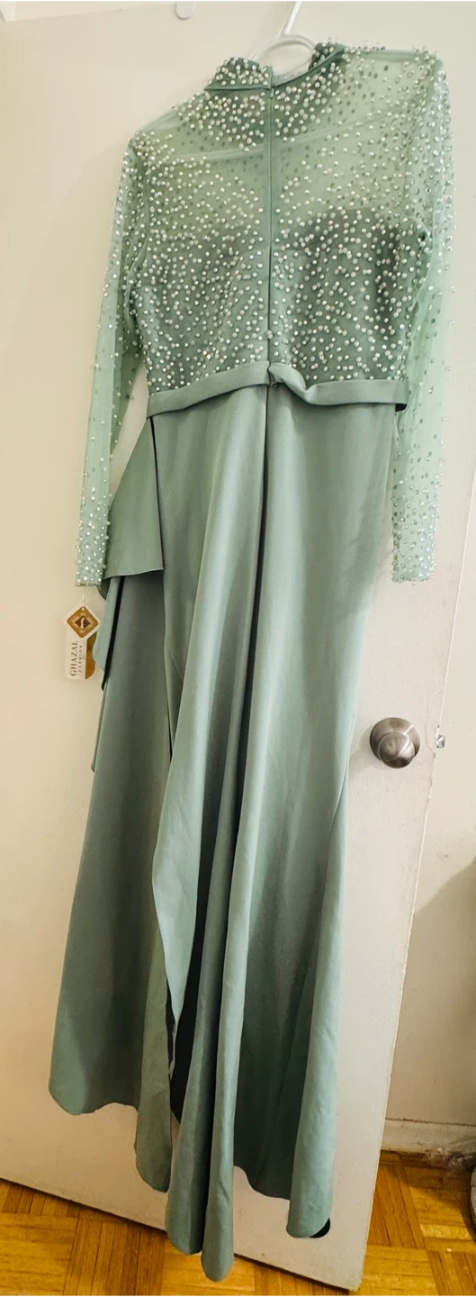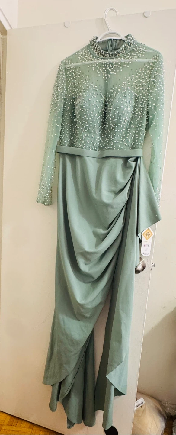 Beautiful sage green evening gown with long sleeves. It features intricate beading and embellishments on the bodice and sleeves. The draped skirt adds a touch of elegance.