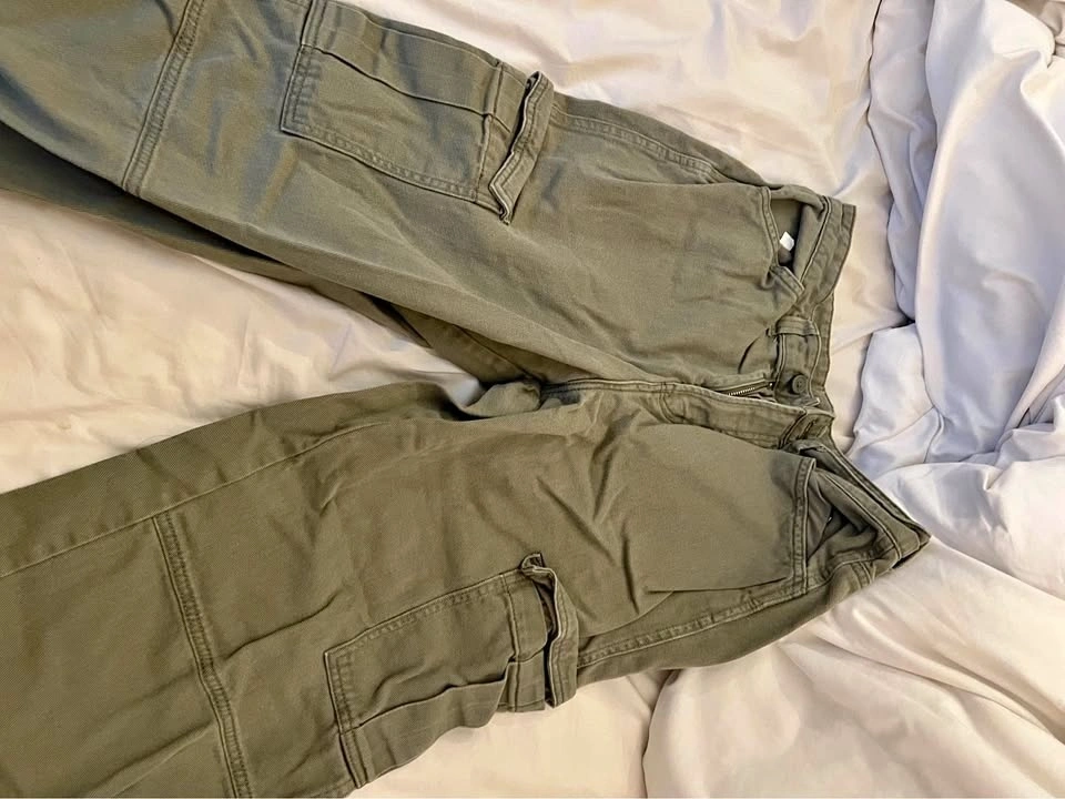Size 4 and waist is roughly 27 inches. Has pockets on the sides of the legs and is more like a straight wide leg pant. Pickup is at Dundas and Spadina