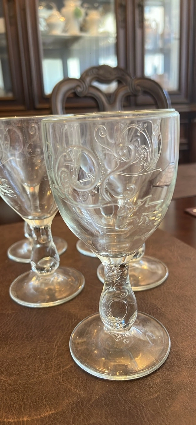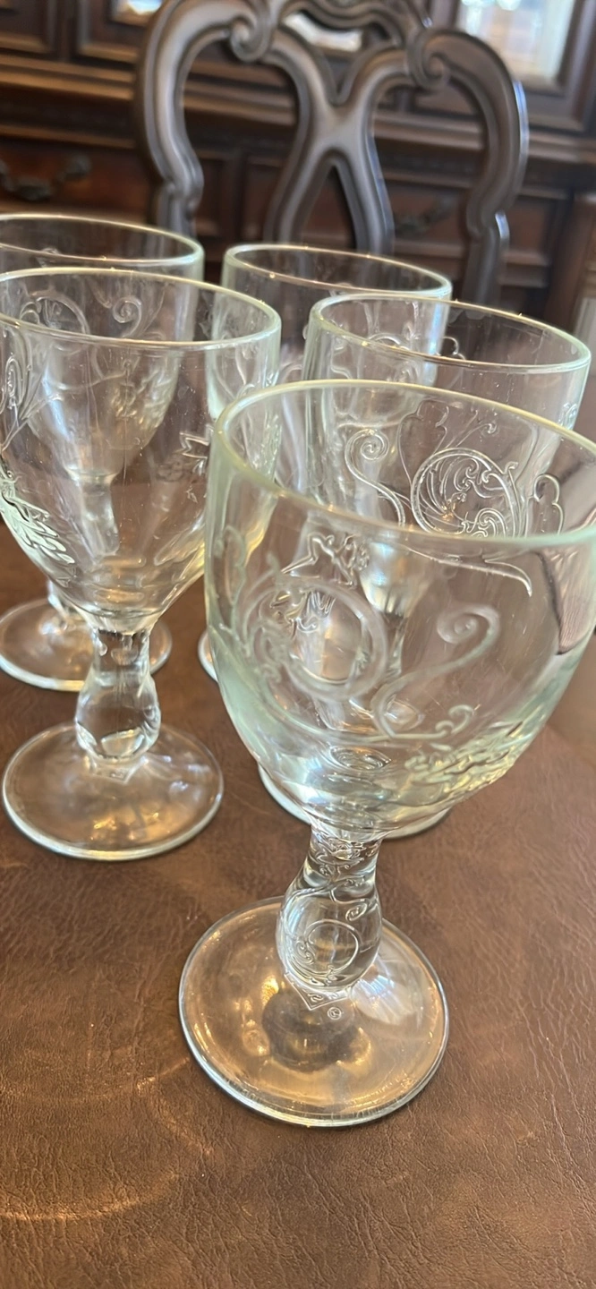 Set of five vintage wine glasses. Clear glass with etched design.
