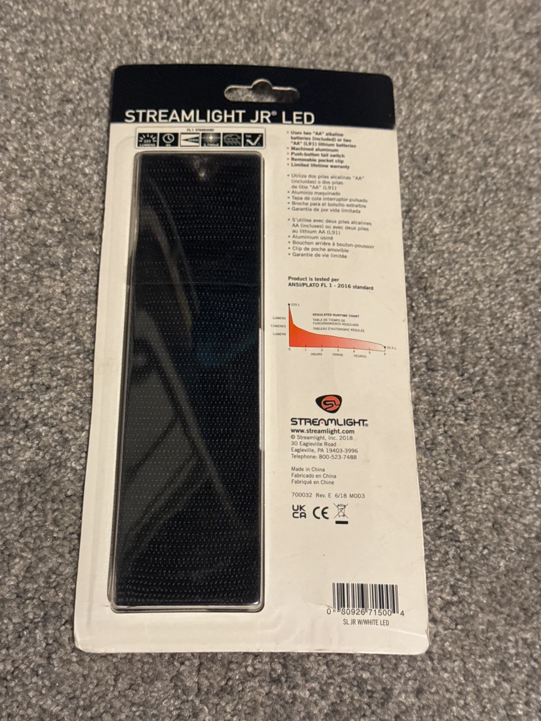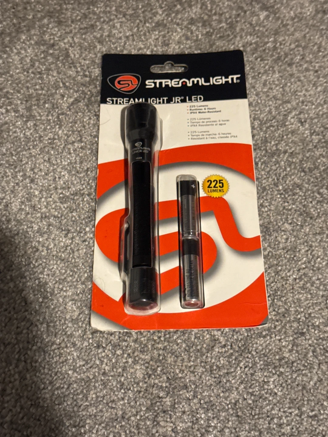This Streamlight Jr. LED flashlight offers 225 lumens and a 6-hour runtime. It's IPX4 water-resistant and includes two "AA" alkaline batteries. The push-button tail switch makes it easy to operate.