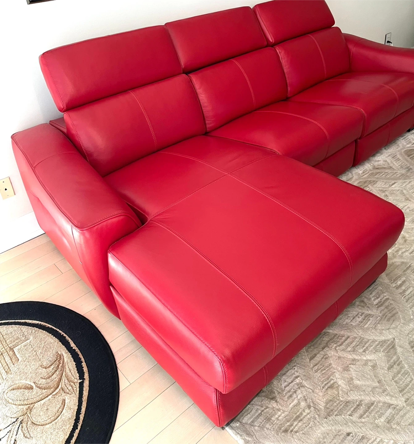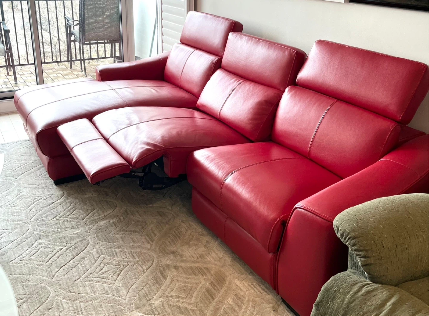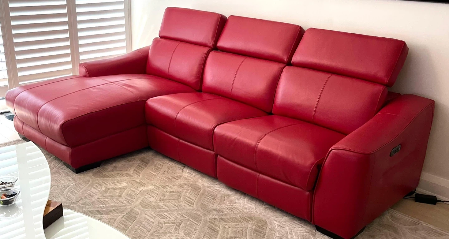 Selling a vibrant red leather sectional sofa! Was imported from Germany , genuine leather . It features reclining seats for ultimate relaxation. The sofa appears to be in great condition and would be a stylish addition to any living room