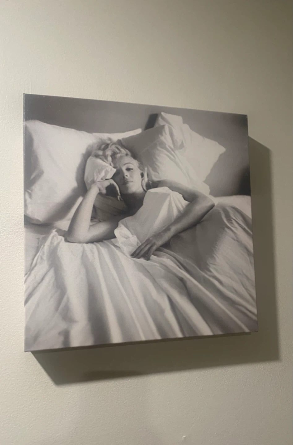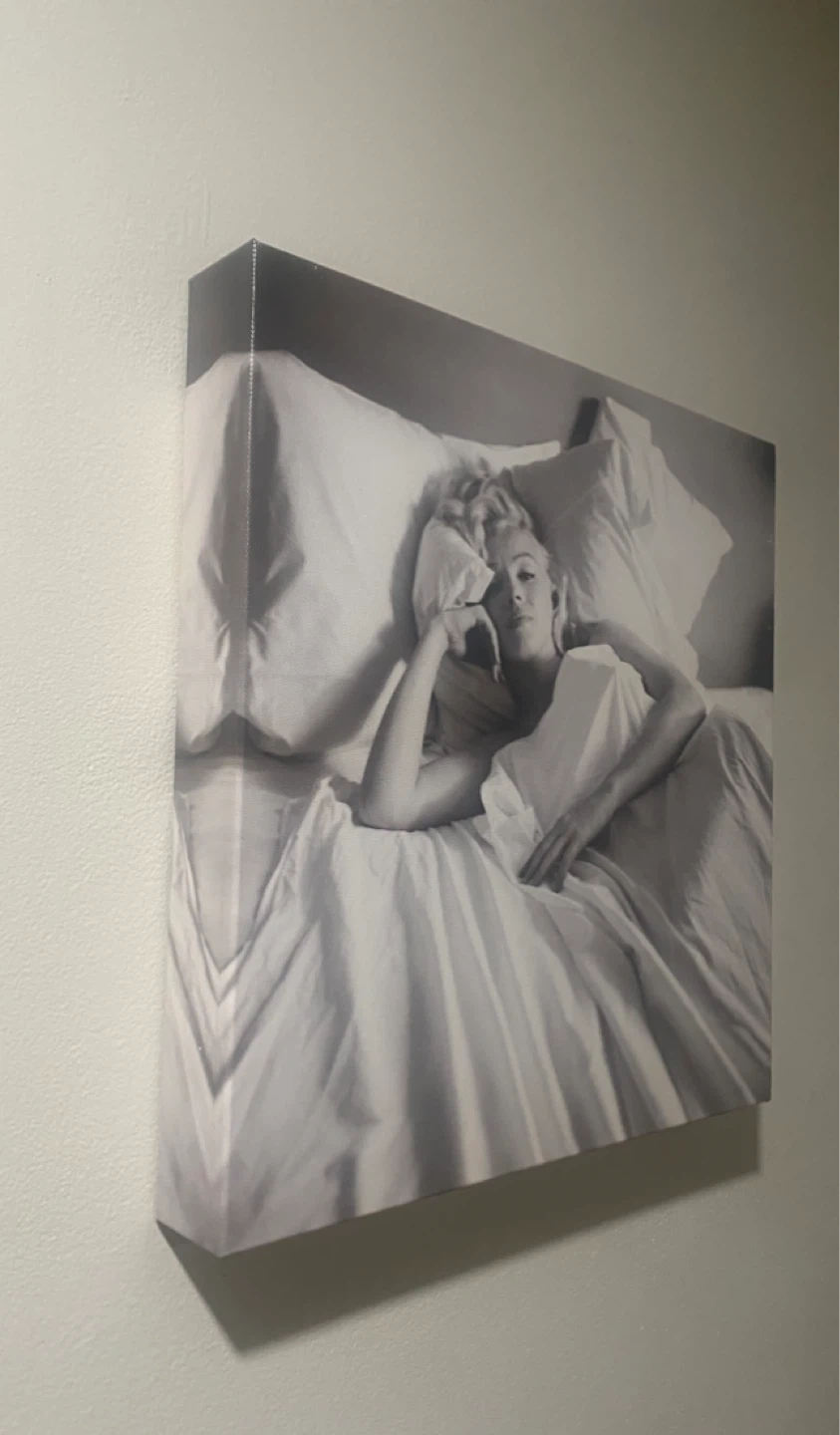 This image is a black and white canvas art print of Marilyn Monroe lying in bed, commonly sold under titles like "Marilyn Monroe - Bed Poster" or "Iconic Bedroom Scene".