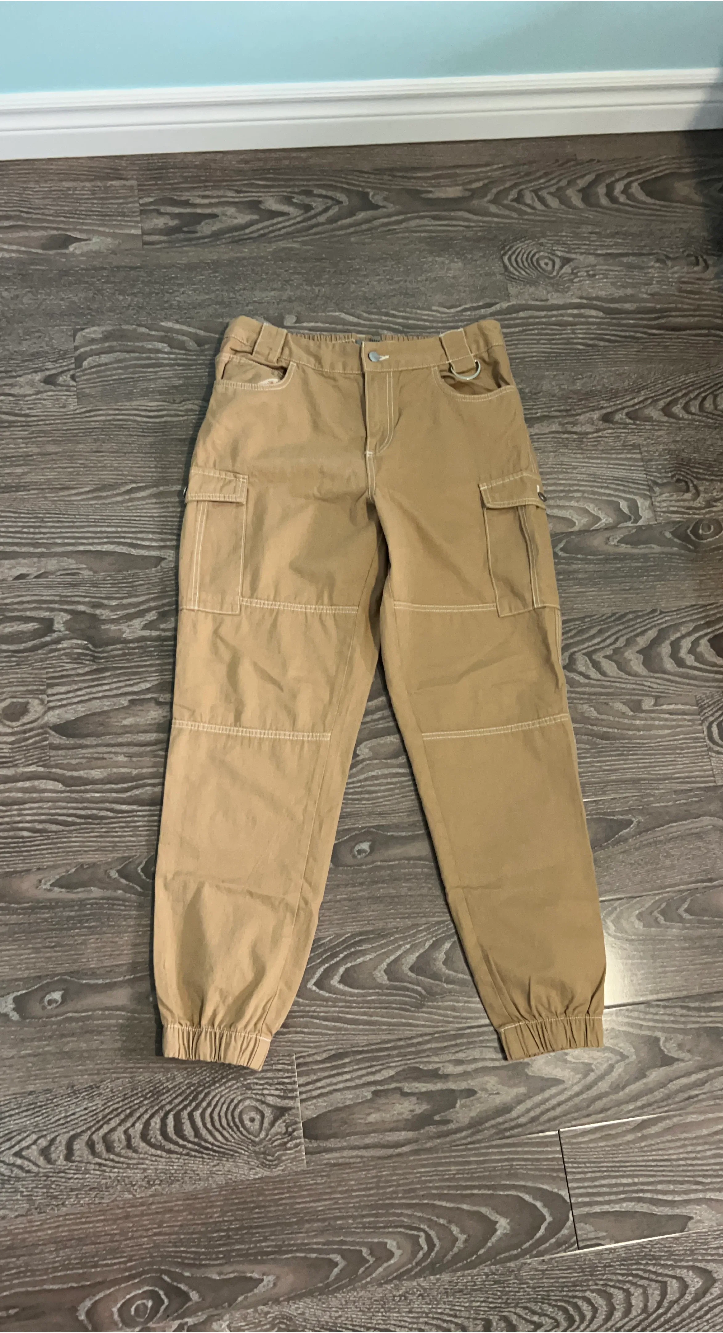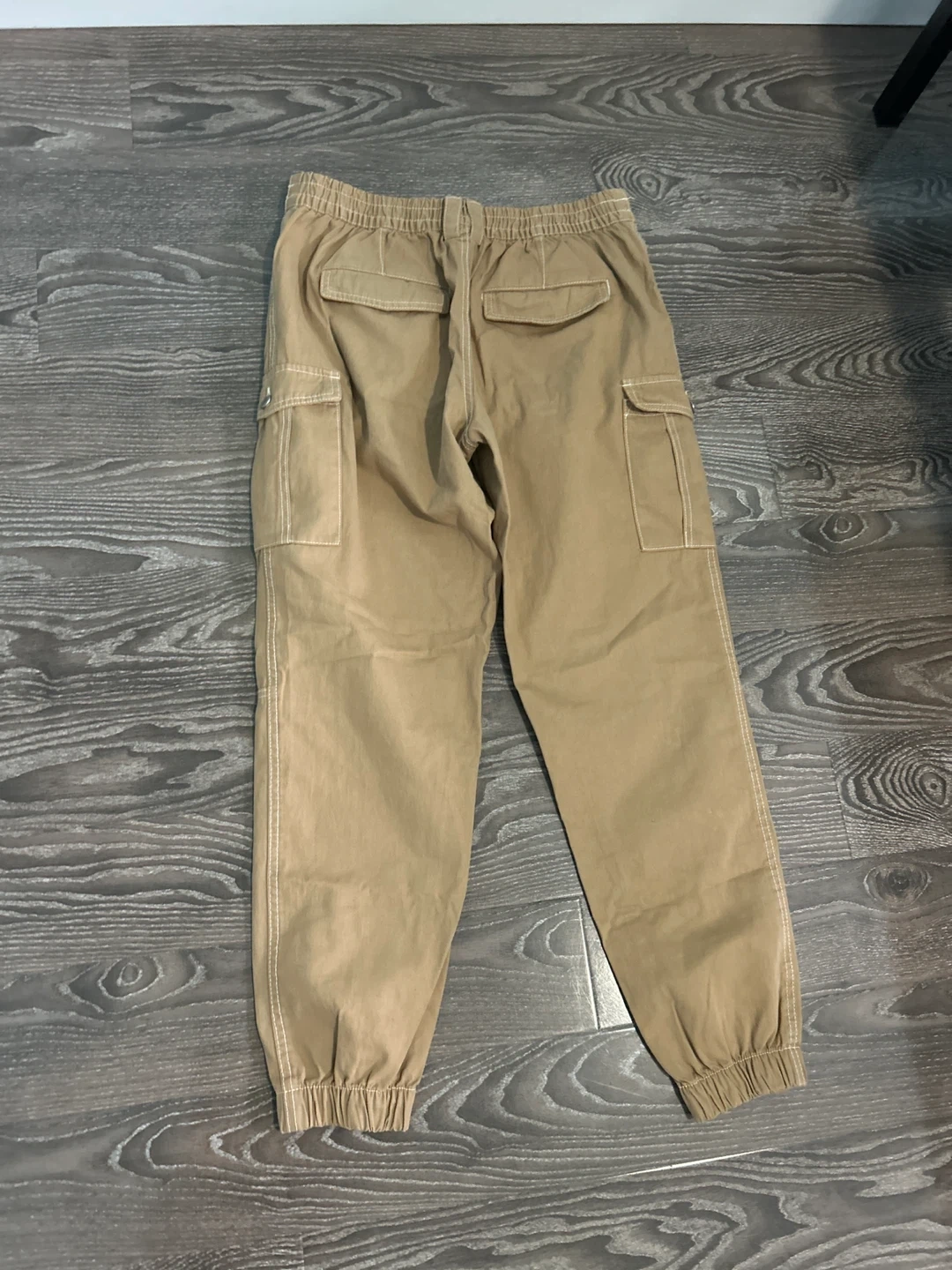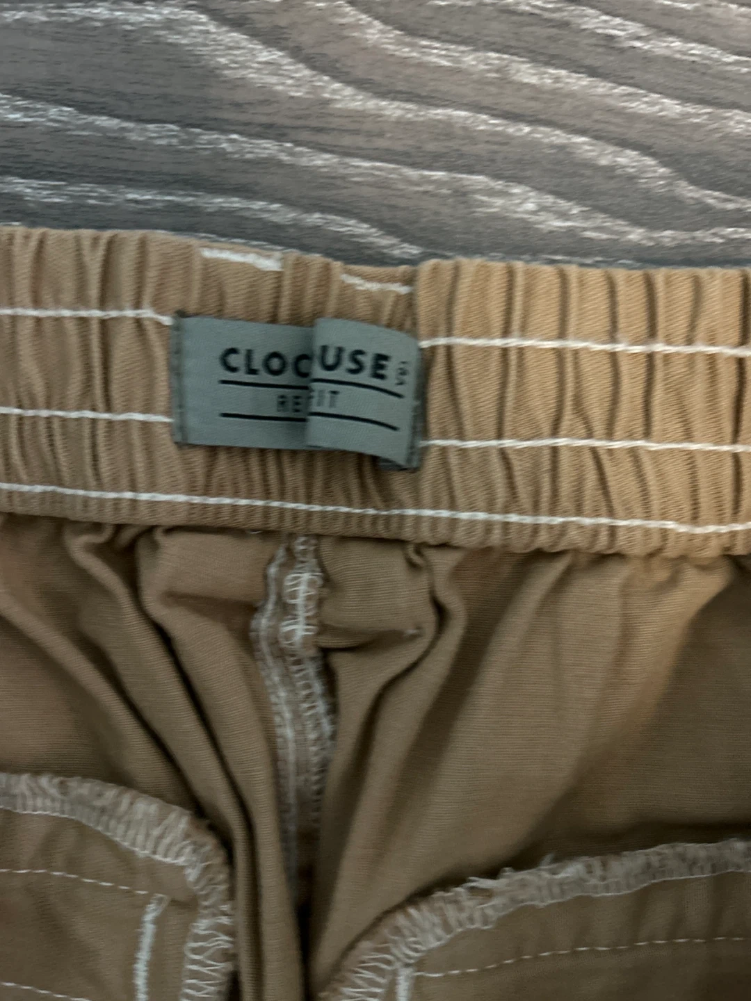 CLOCKHOUSE tan cargo pants with elastic waistband and cuffs. These pants have a relaxed fit and feature multiple pockets. Cotton blend material.