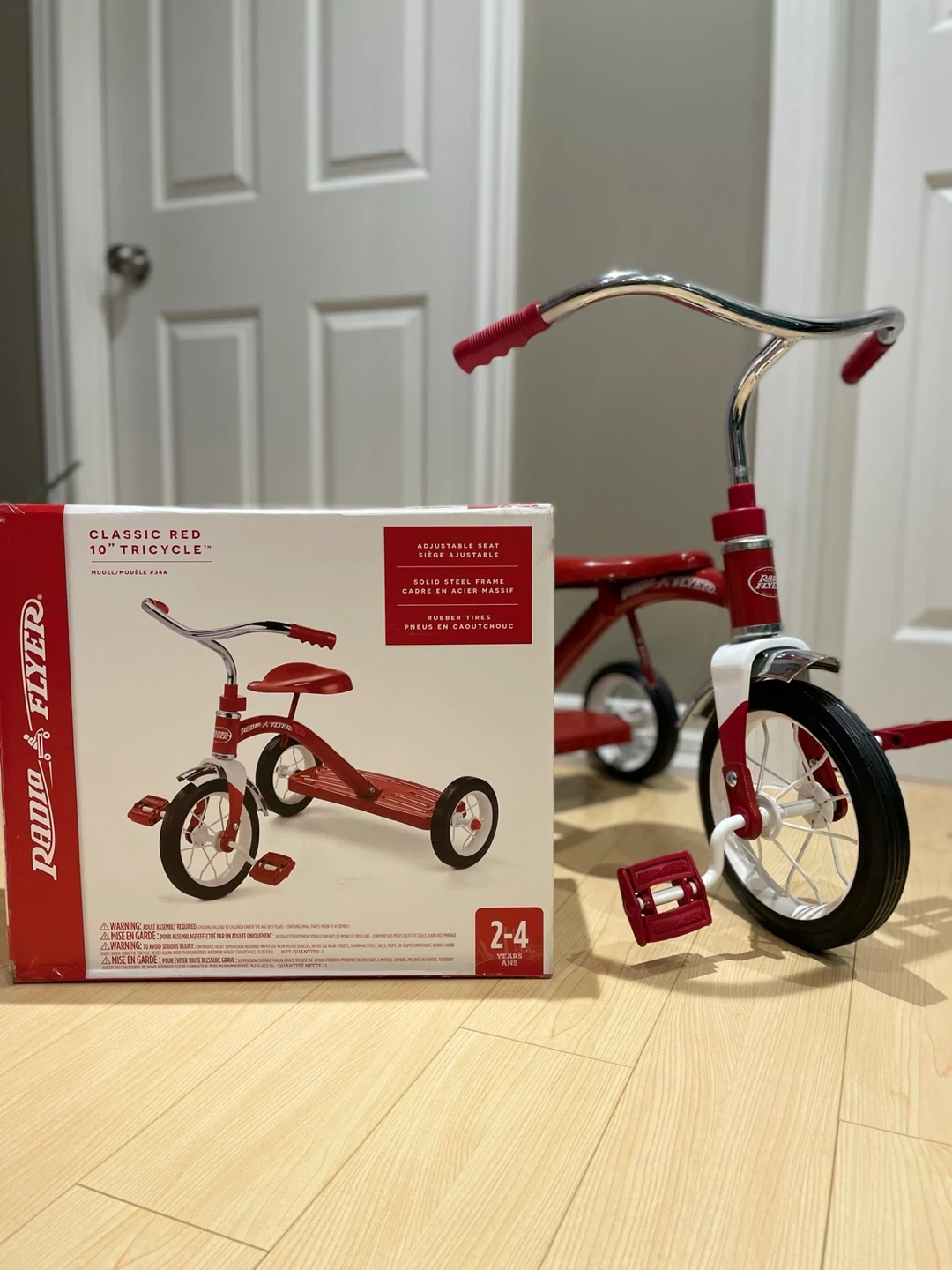 Classic red 10" tricycle. Features a steel frame and rubber tires. Recommended for ages 2-4 years.