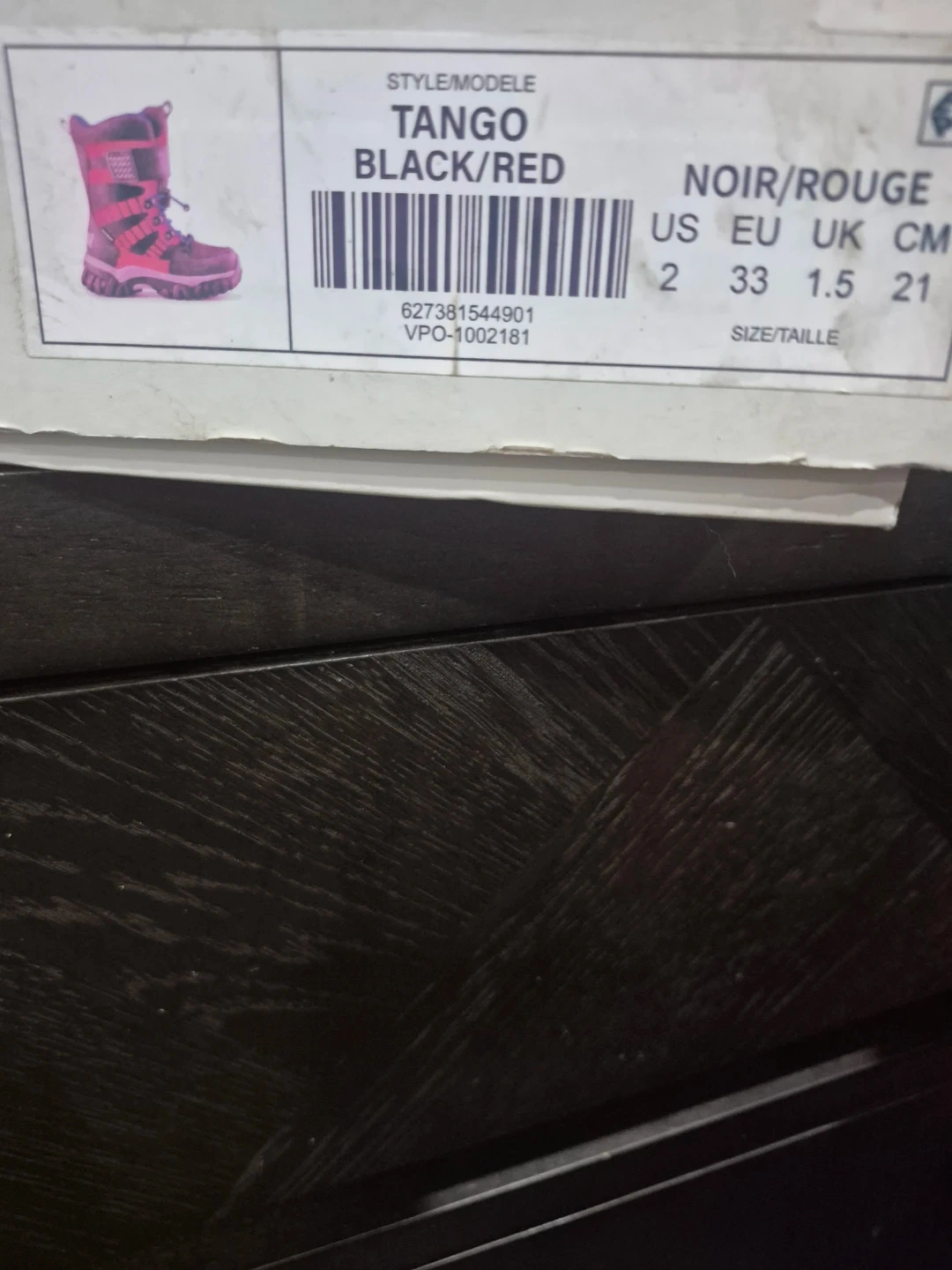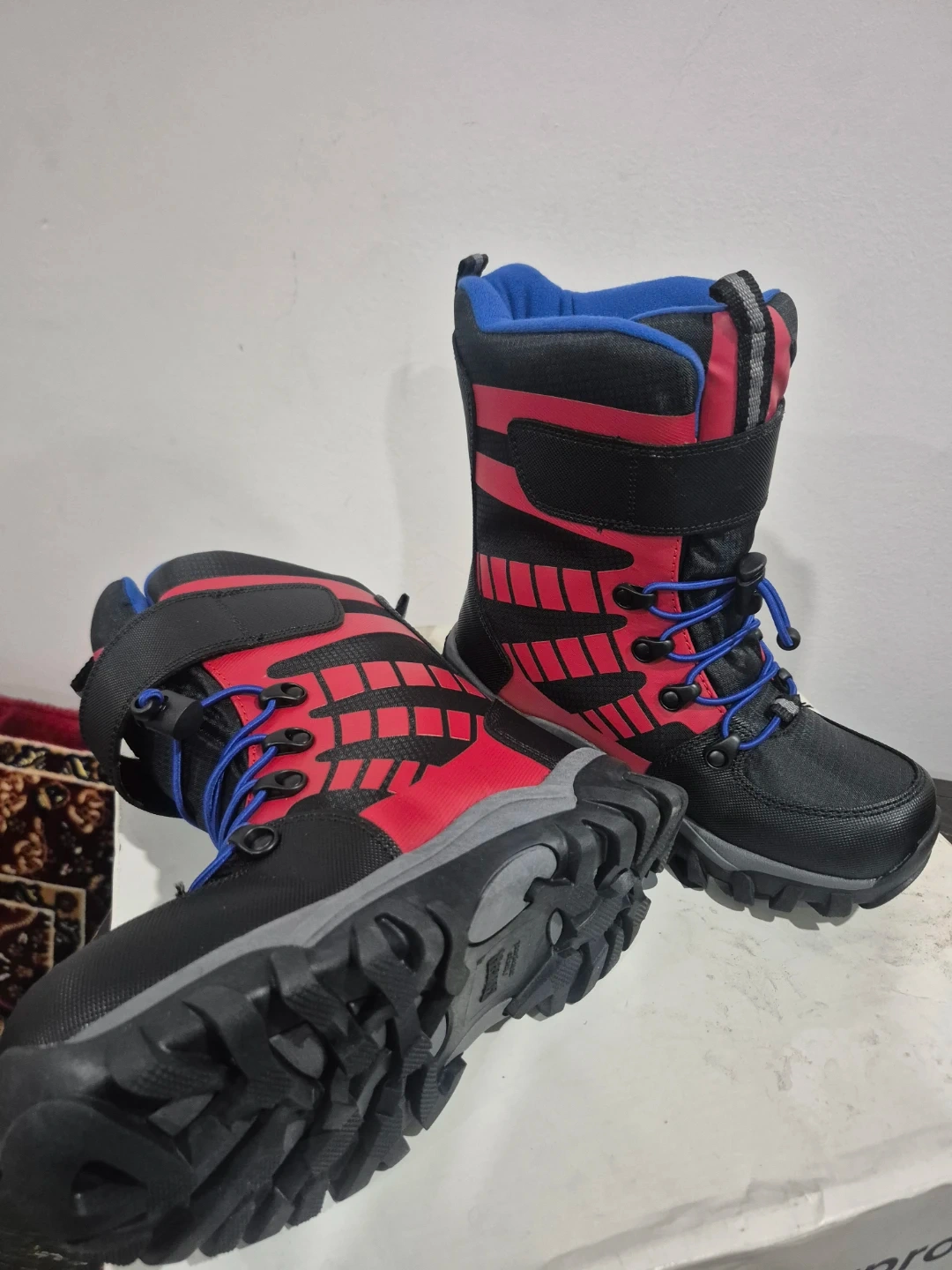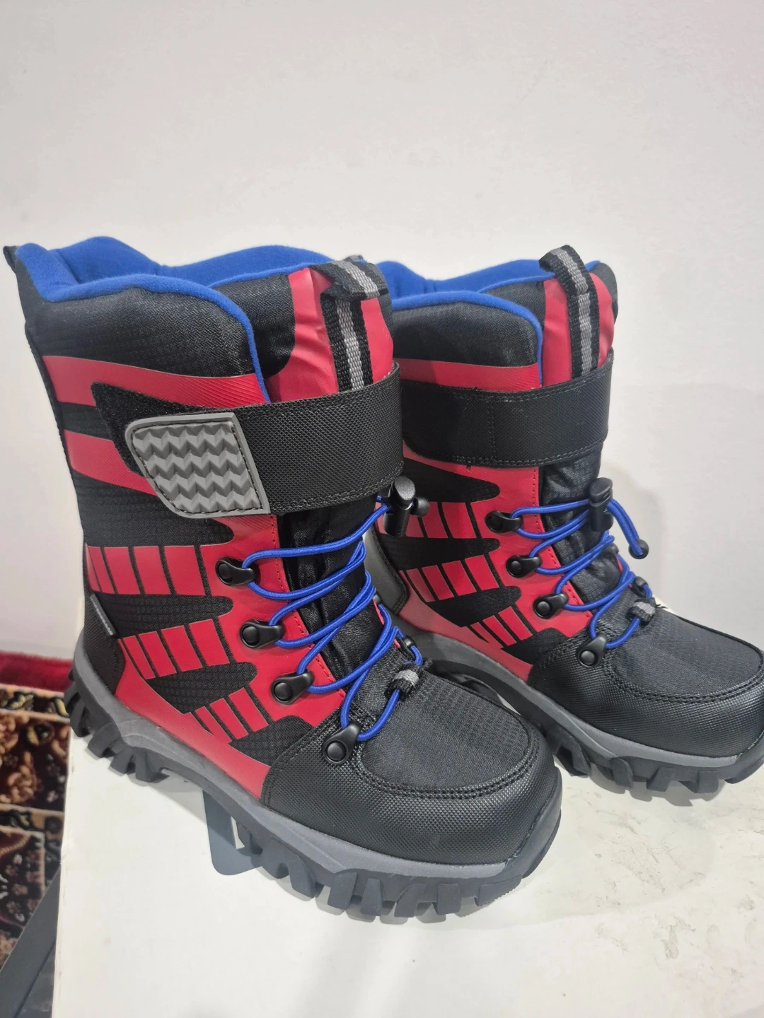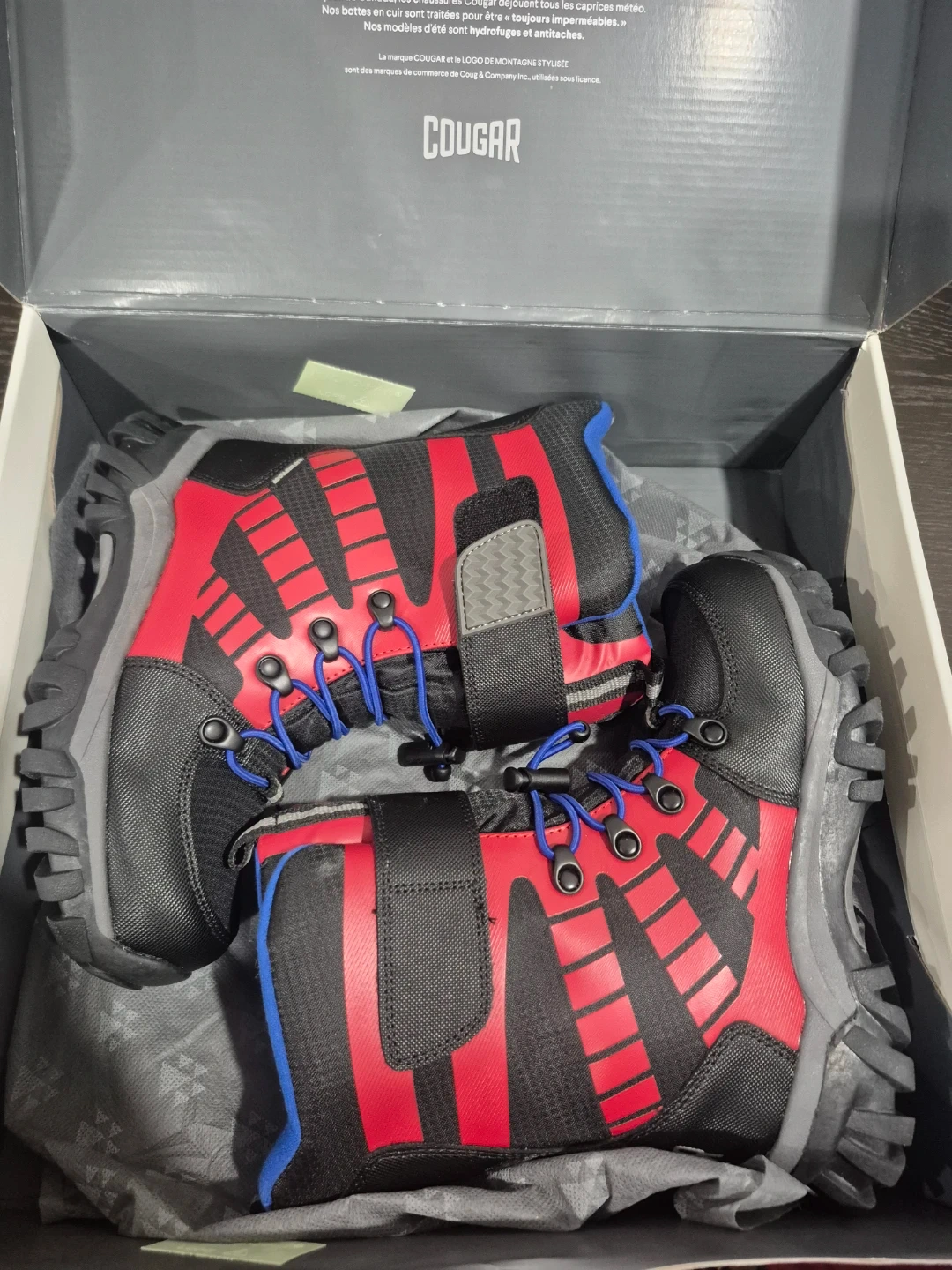 These Cougar Tango boots are designed for winter adventures. They're black and red with blue laces. Waterproof construction to keep feet dry and warm. Size is 2 (US).
