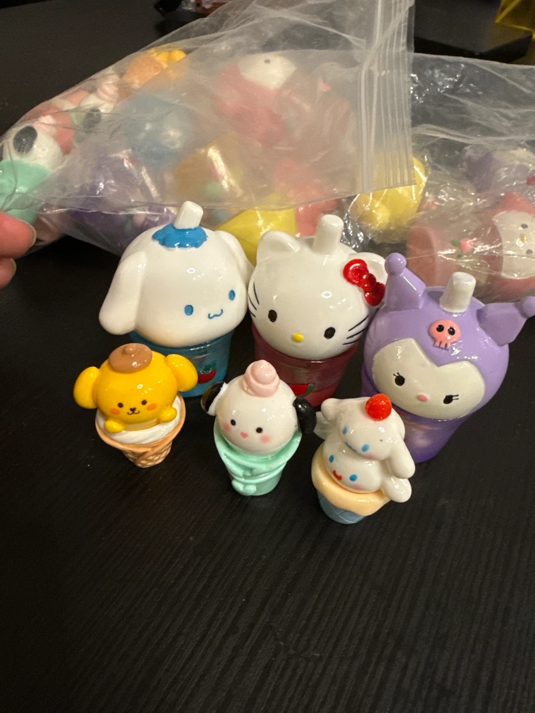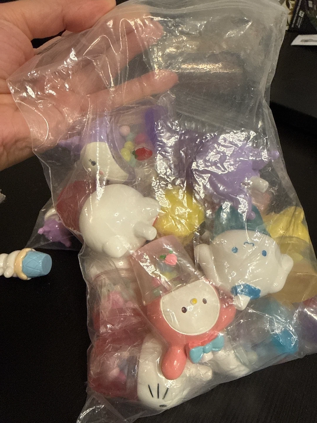 Assorted Sanrio character mini figures in a bag. Includes Hello Kitty, Cinnamoroll, Pompompurin, and My Melody.
