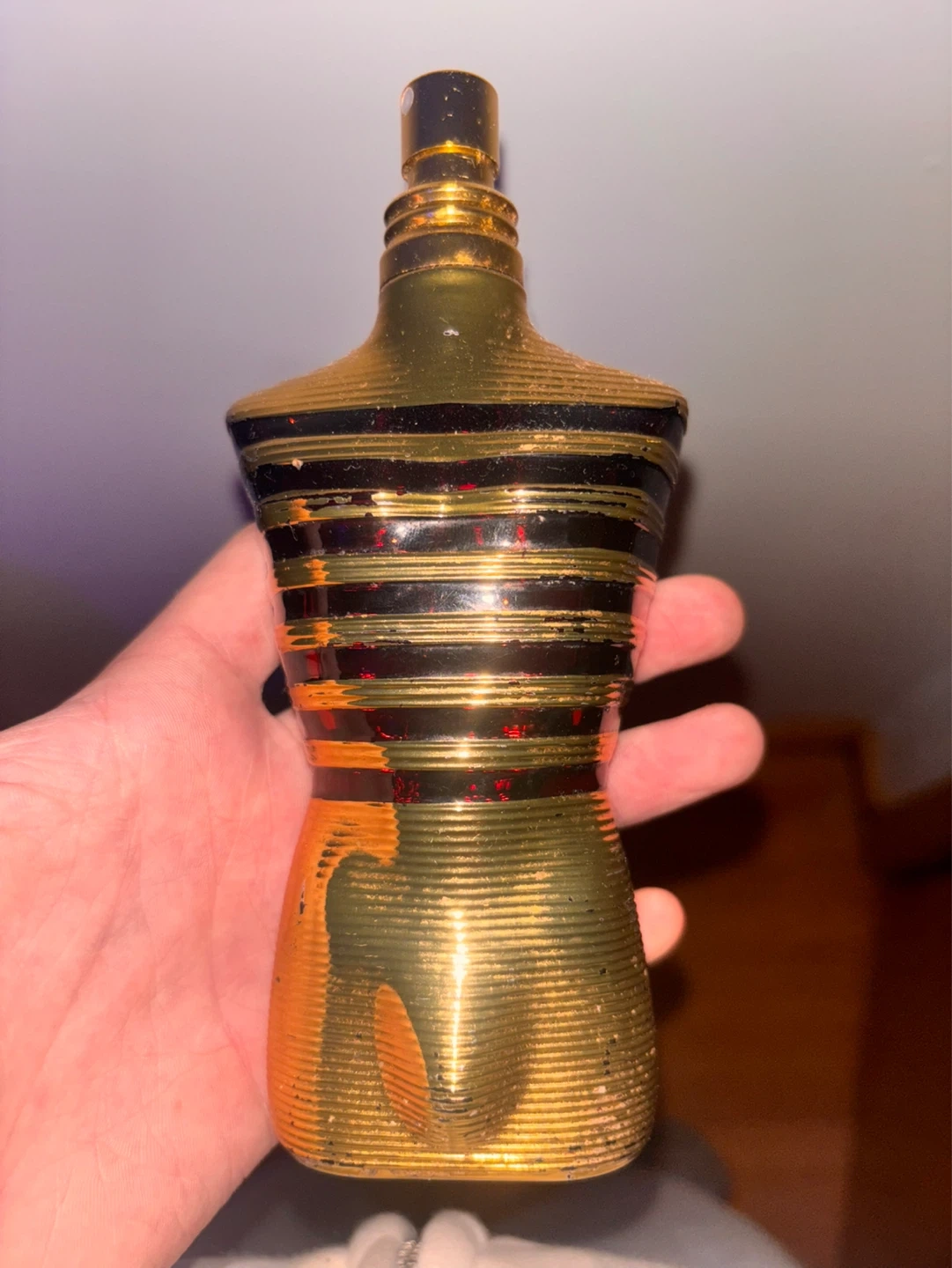 A bottle of Jean Paul Gaultier Le Male Elixir perfume. It's a gold-coloured bottle with black stripes, shaped like a torso. The original cylindrical container is also included. 75% full my mum doesn’t like the scent so I’m selling it