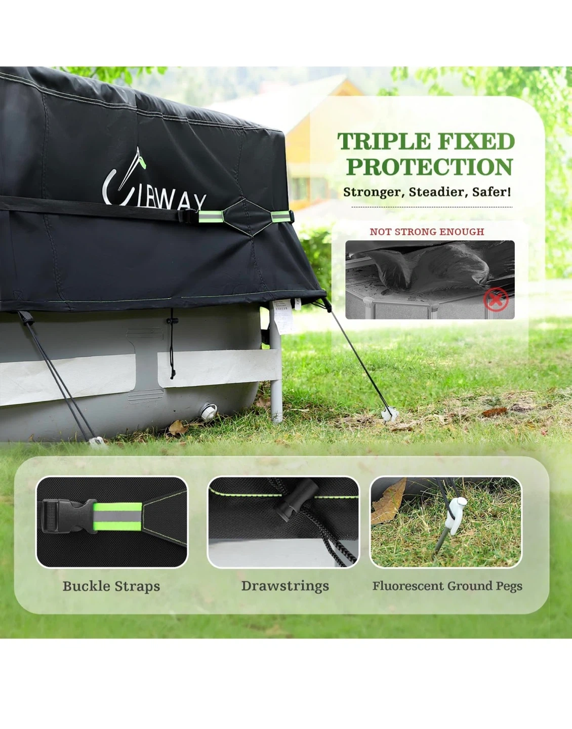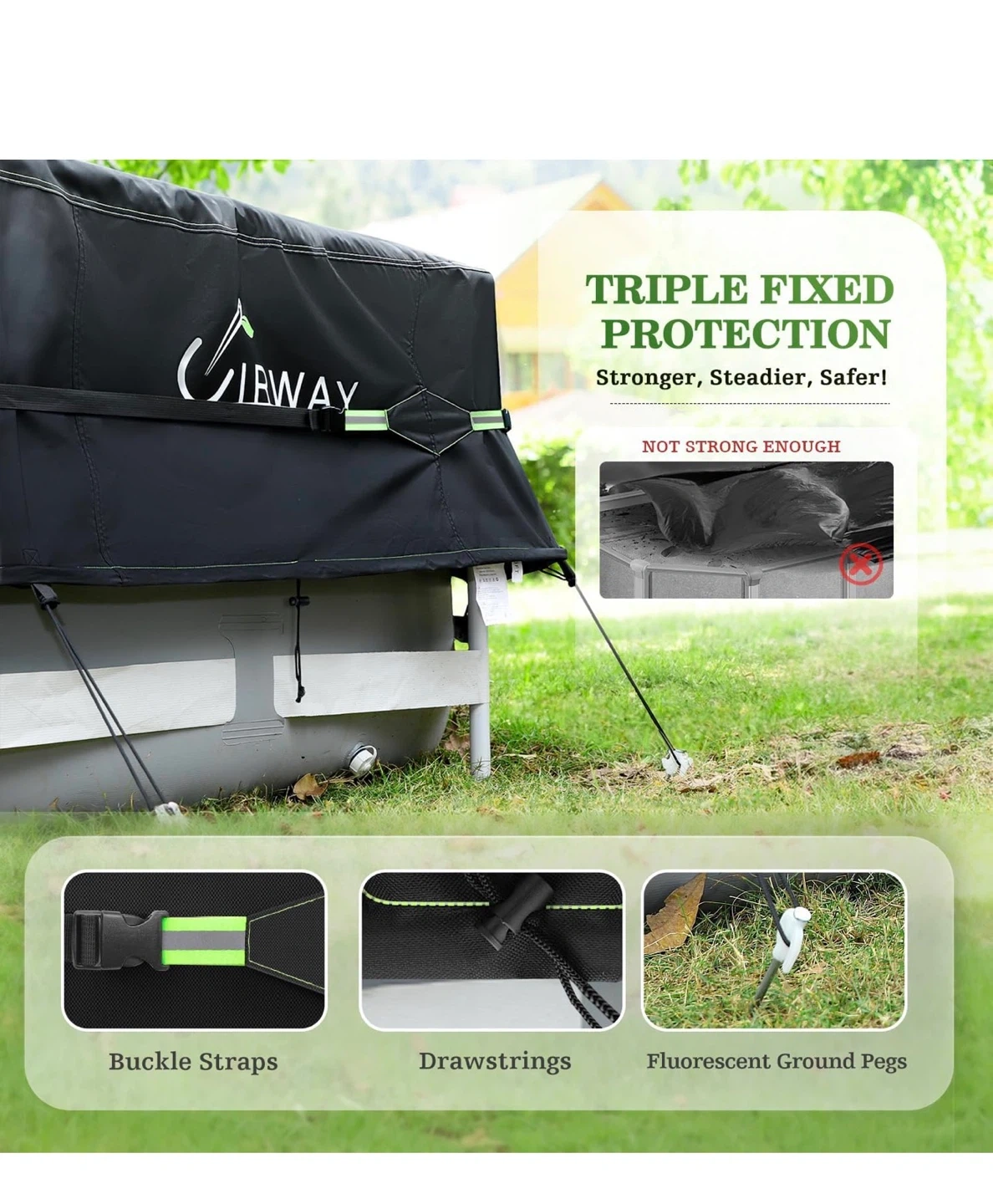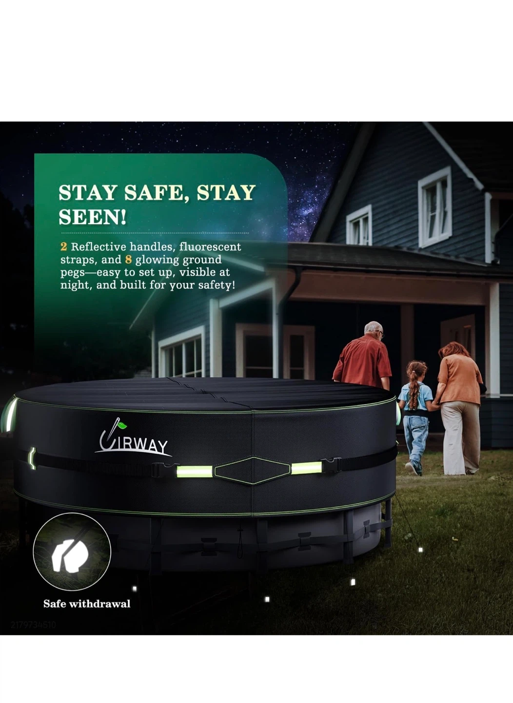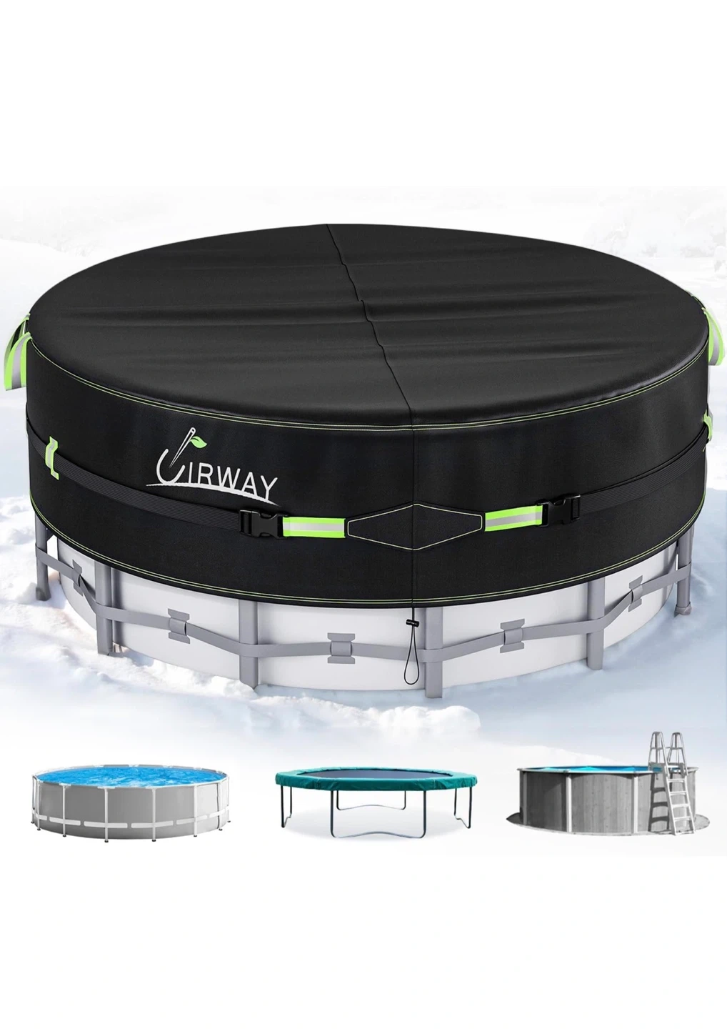 63Get this CIRWAY 21 Ft Round Pool Cover with Reflective Strips to keep your pool clean and safe! It fits up to a 252"L x 252"W x 18"H pool. The cover includes rope ties and luminous ground nails for UV protection. It also features triple fixed protection with buckle straps, drawstrings, and fluorescent ground pegs for a stronger, steadier, and safer fit