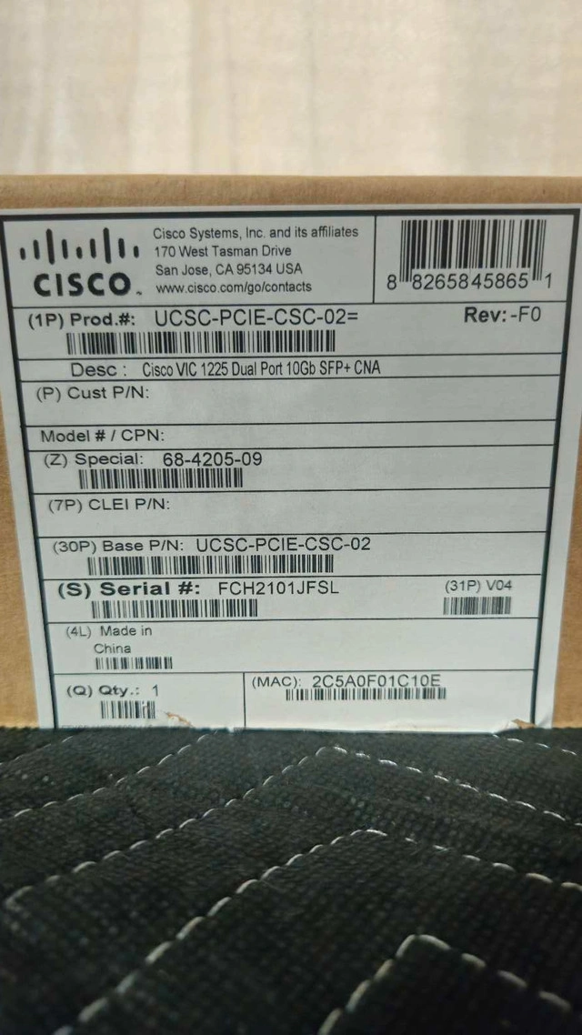 12Selling a new Cisco VIC 1225 Dual Port 10Gb SFP+ CNA, a high-performance converged network adapter designed to enhance your server's connectivity. This adapter supports both networking and storage protocols, making it ideal for demanding data center environments. Key Features: * Dual-port 10Gb SFP+ connectivity * Converged Network Adapter (CNA) functionality * Supports networking and storage protocols * Designed for data center environments BRAND NEW NEVER USED! If you're seeing this ad, the item is available!