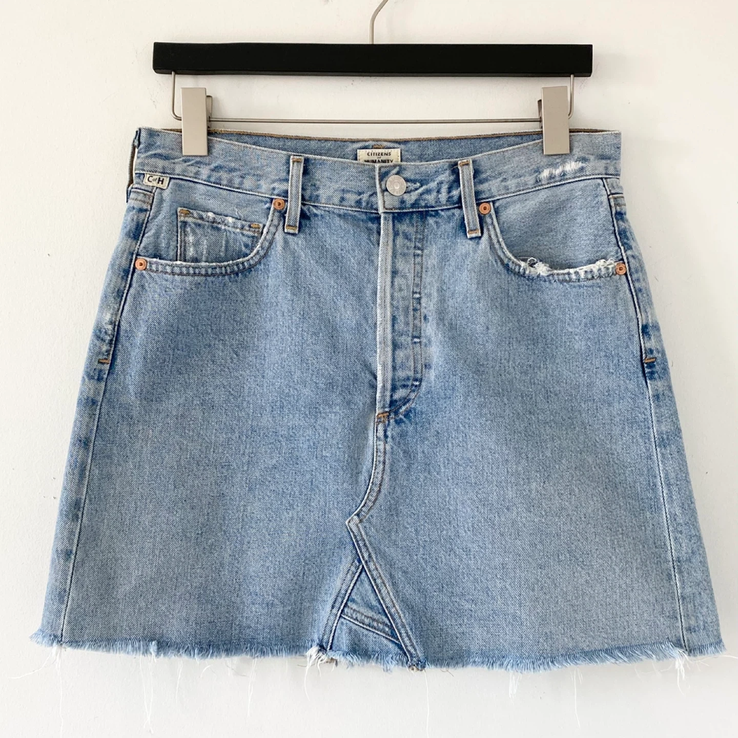 615Pick up only in Leslieville (Queen and Pape) Check out other listings! Citizen of Humanity denim mini skirt. Made of lightweight 100% cotton. There's no staining or damage. It's clean and in great condition. Made in USA Size 29 Approximate measurements laid flat Waist 15” Center back length 16.75”