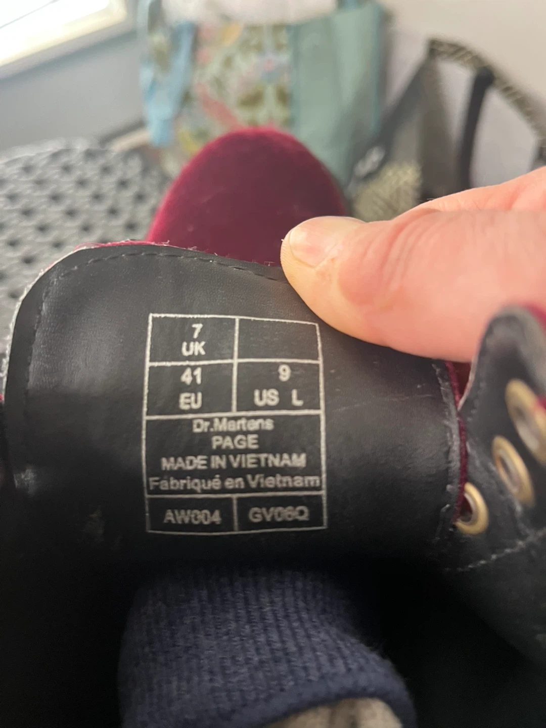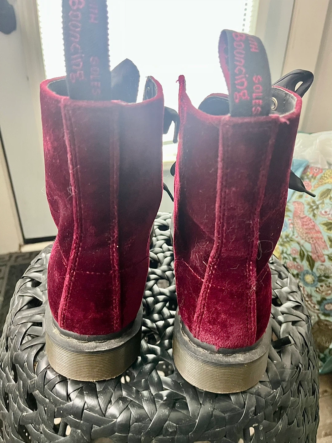 These rare boots are the Dr. Martens 1460 Pascal Velvet 8-Hole Boots in the "Cherry Red" colorway. This specific model is part of their vegan line, crafted from high-quality, animal-friendly velvet. Size in the photos.