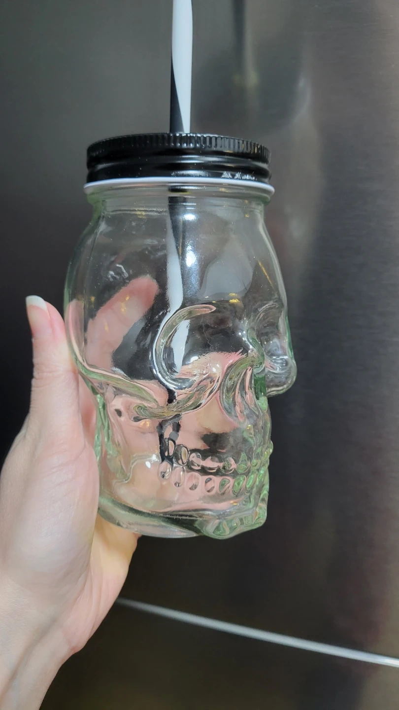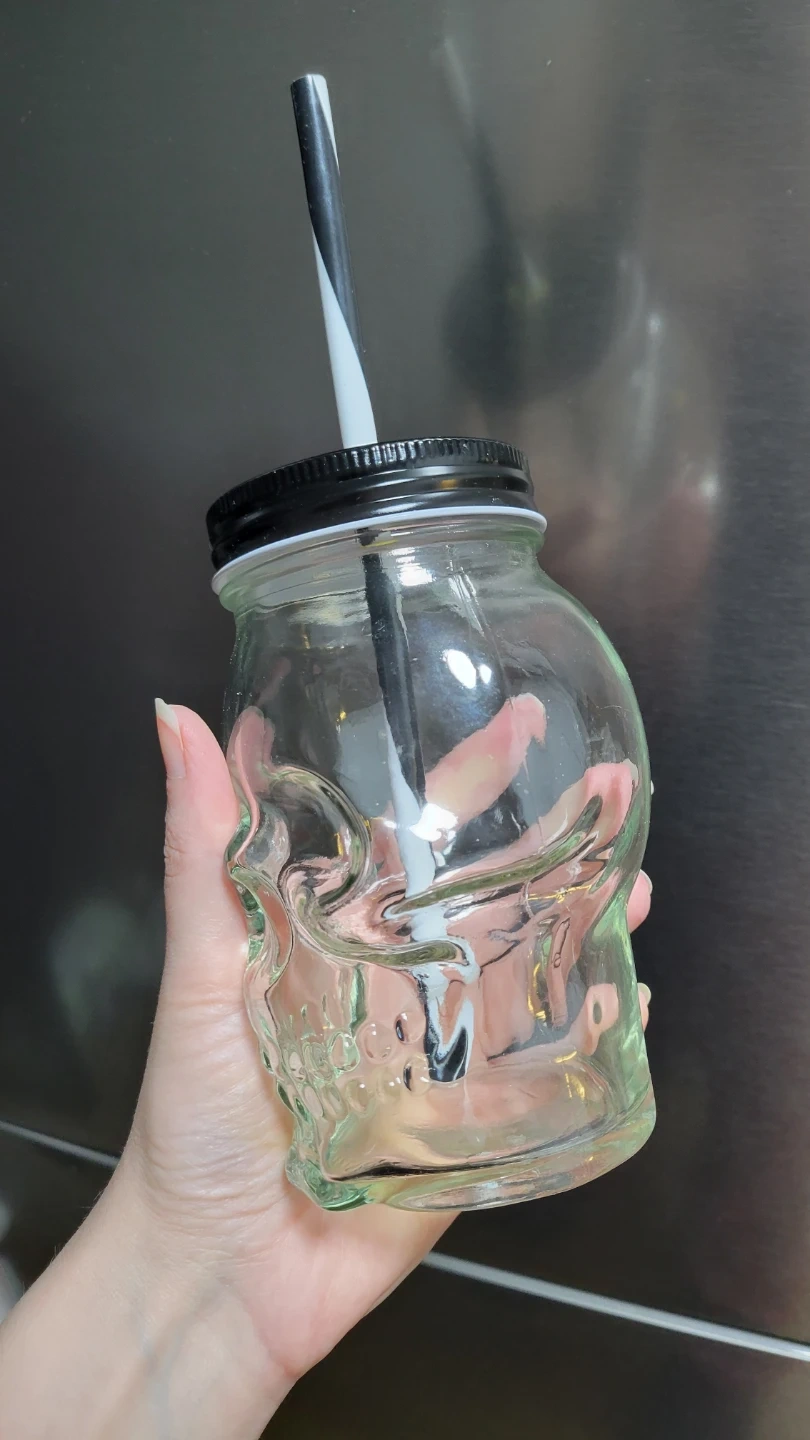 A clear glass jar shaped like a skull. It comes with a black lid and a black and white striped straw. This unique mug is great for Halloween parties or everyday use!