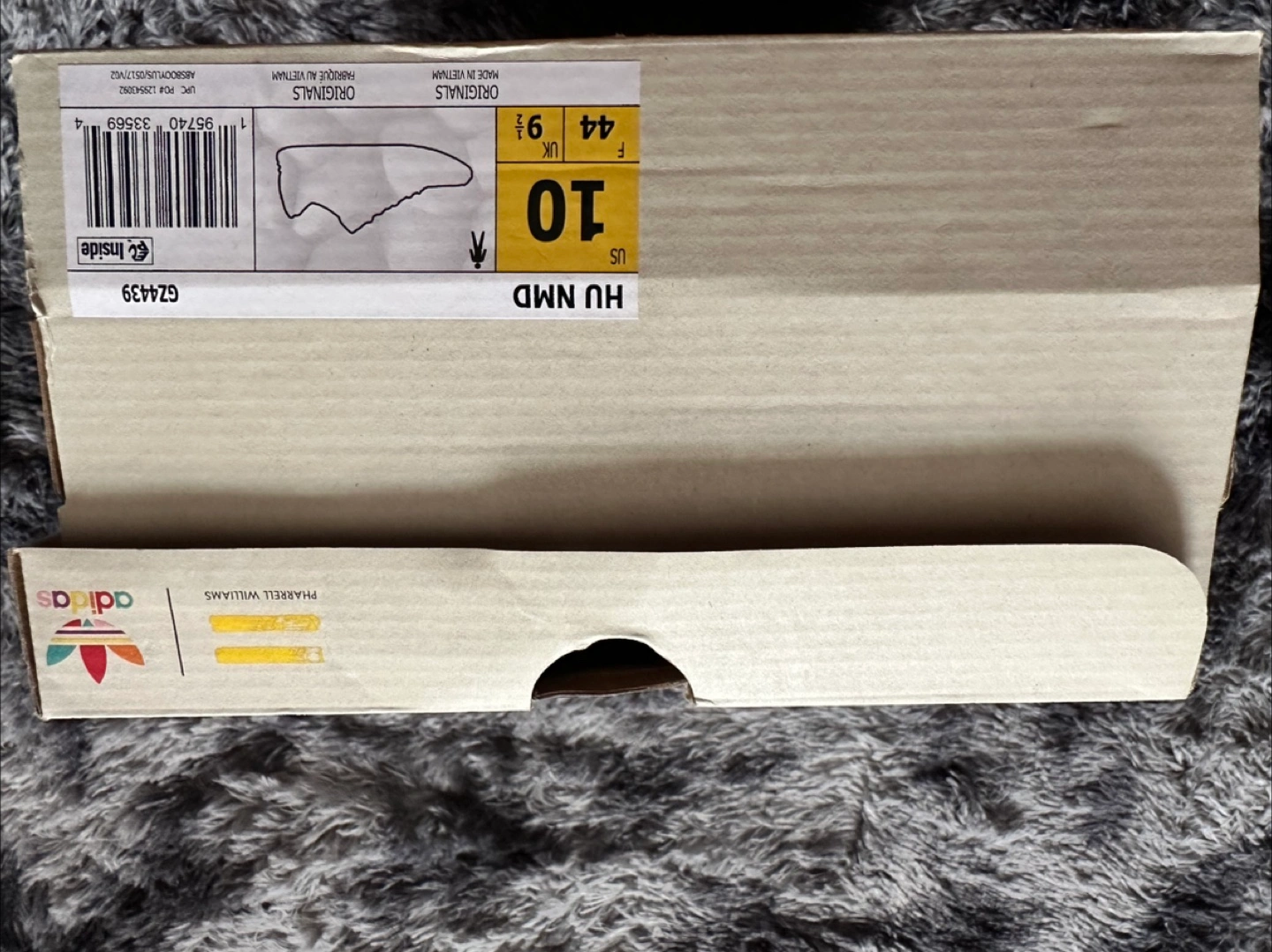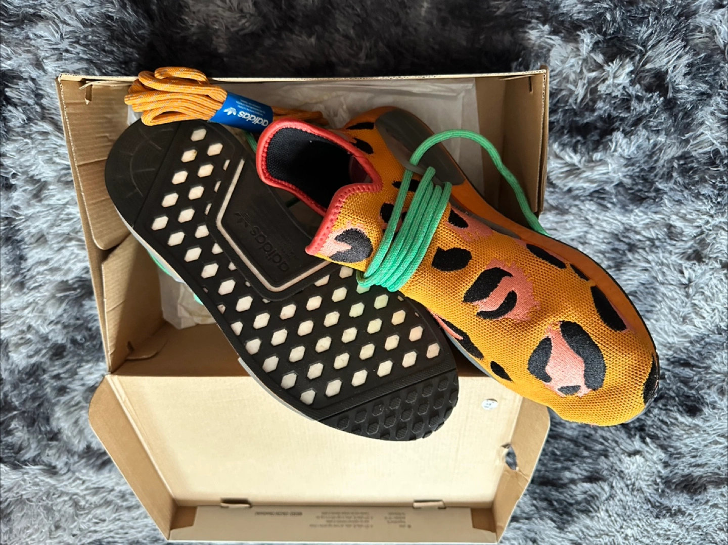 Adidas HU NMD sneakers. Size 10. Leopard print. New in box. Orange, pink, and green accents. Unique lacing system. Basically new.