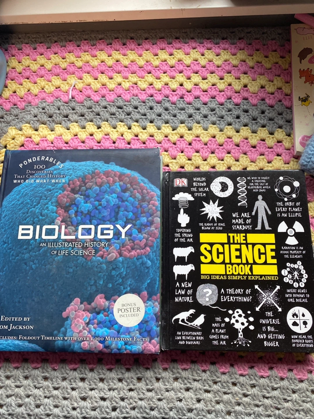 Two illustrated books covering science and biology. Biology: An Illustrated History of Life Science includes a foldout timeline and over 1,000 milestone facts. The Science Book: Big Ideas Simply Explained explores diverse scientific concepts. Bonus poster included with the biology book.