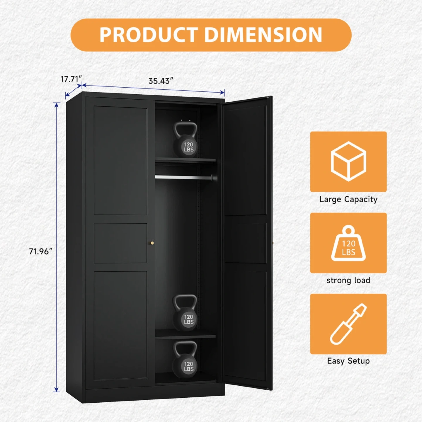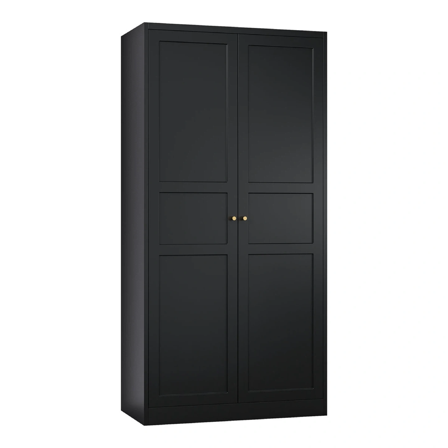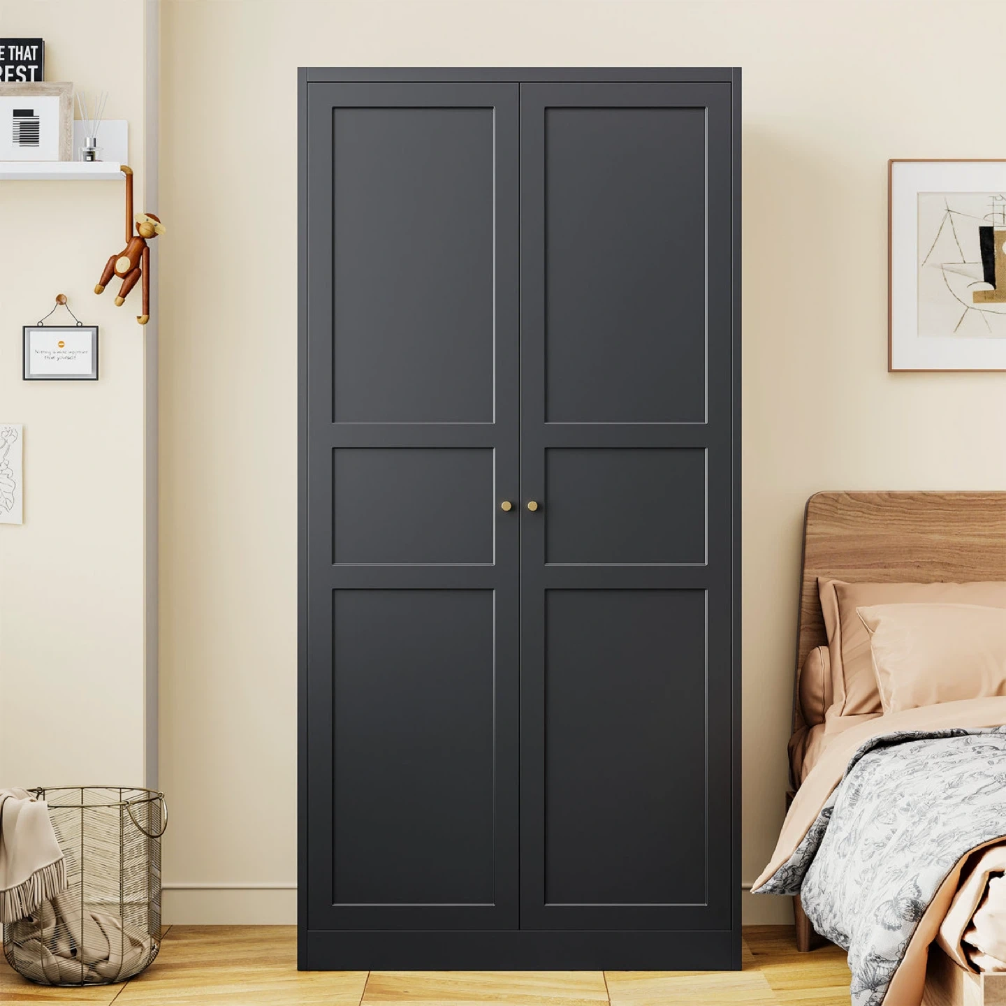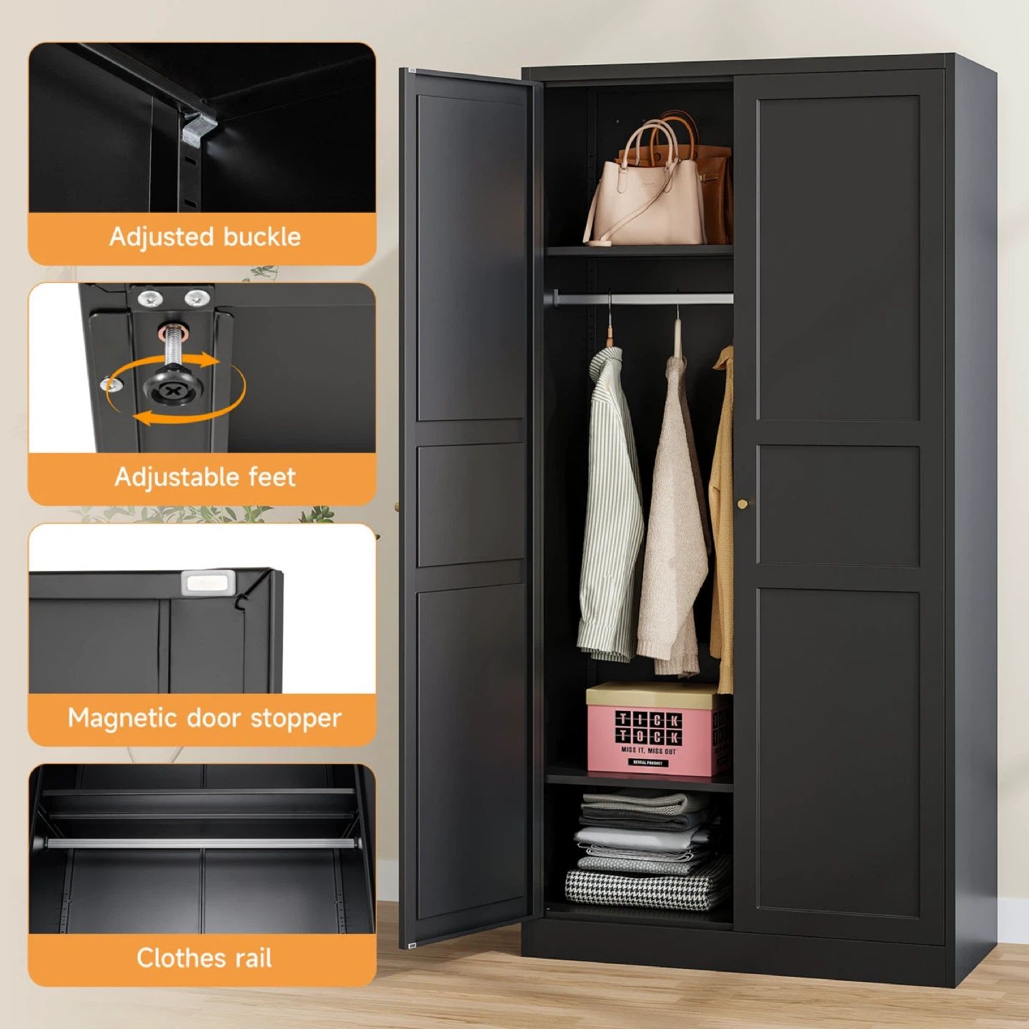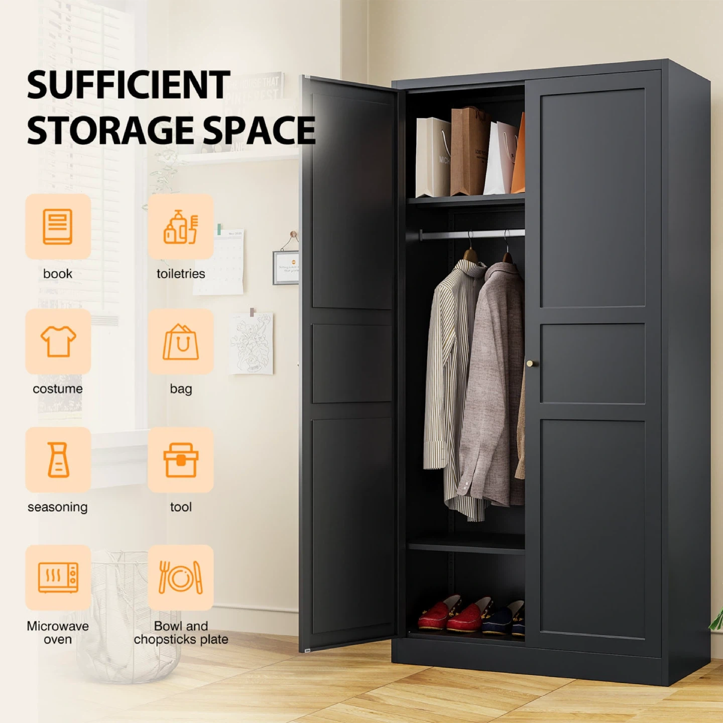 This black double door wardrobe offers ample storage with a hanging rail and shelves. It features adjustable feet for stability and magnetic door stoppers. A great addition for organizing clothes and shoes!