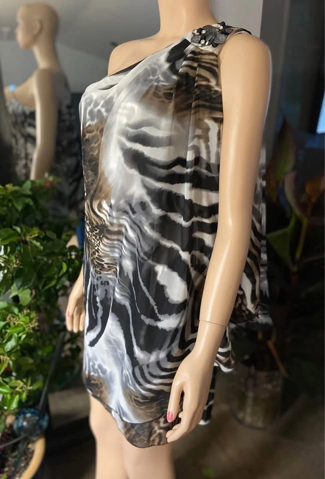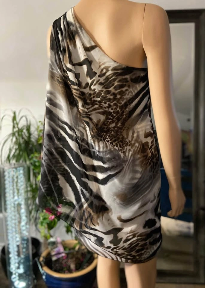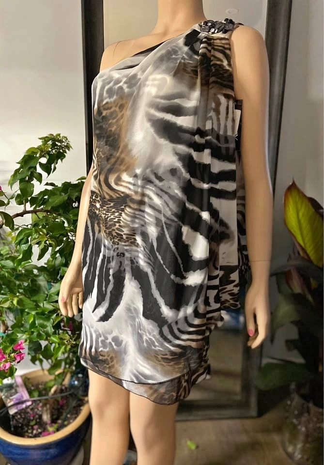 NWT: Onyx Nite Brown Chiffon Animal Print Embellished One-Shoulder Casual Dress (Size 2) 403