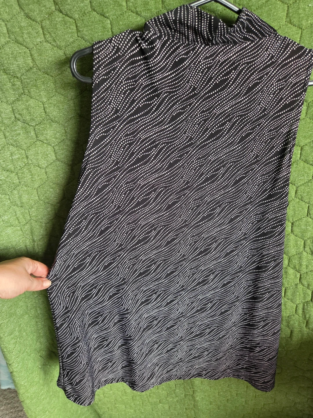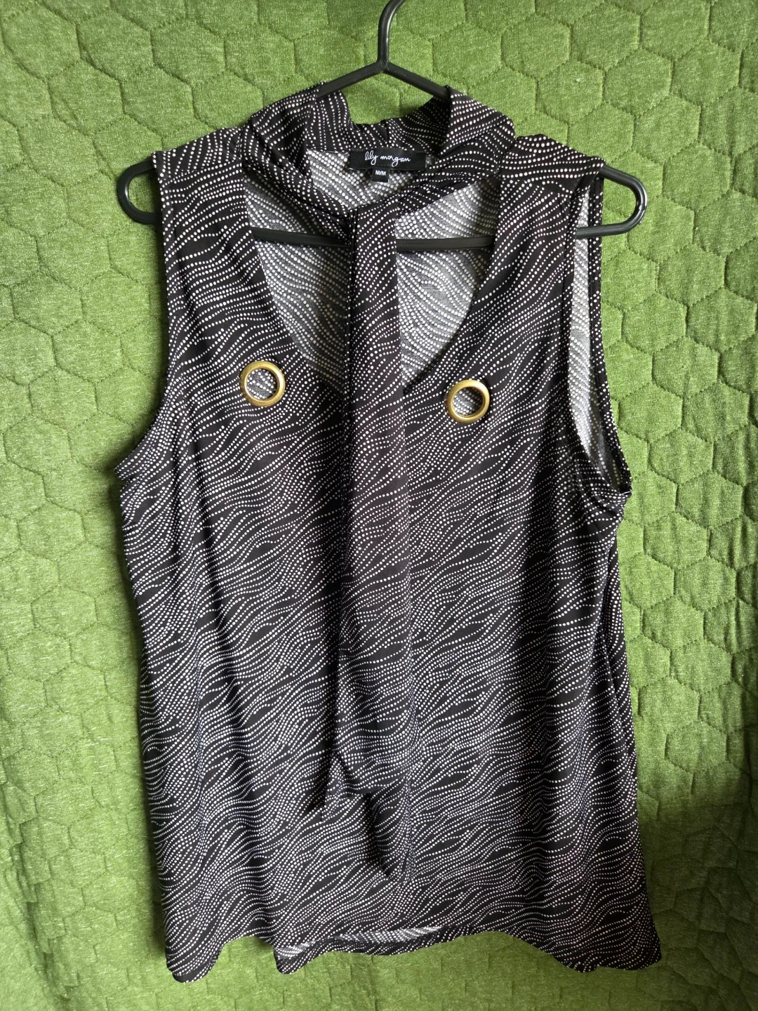 Sleeveless black top with a white wavy dot pattern. It has a cowl neck and gold grommet details at the neckline. Material is lightweight and flowy. Great for dressing up or down!