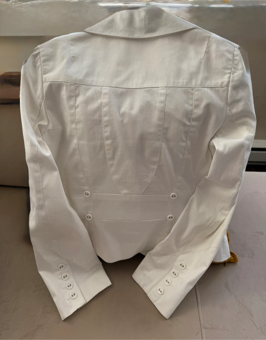 This is a white blazer from Ricki's. It features a single button closure and decorative buttons on the cuffs. The jacket has a structured collar and front flap pockets.