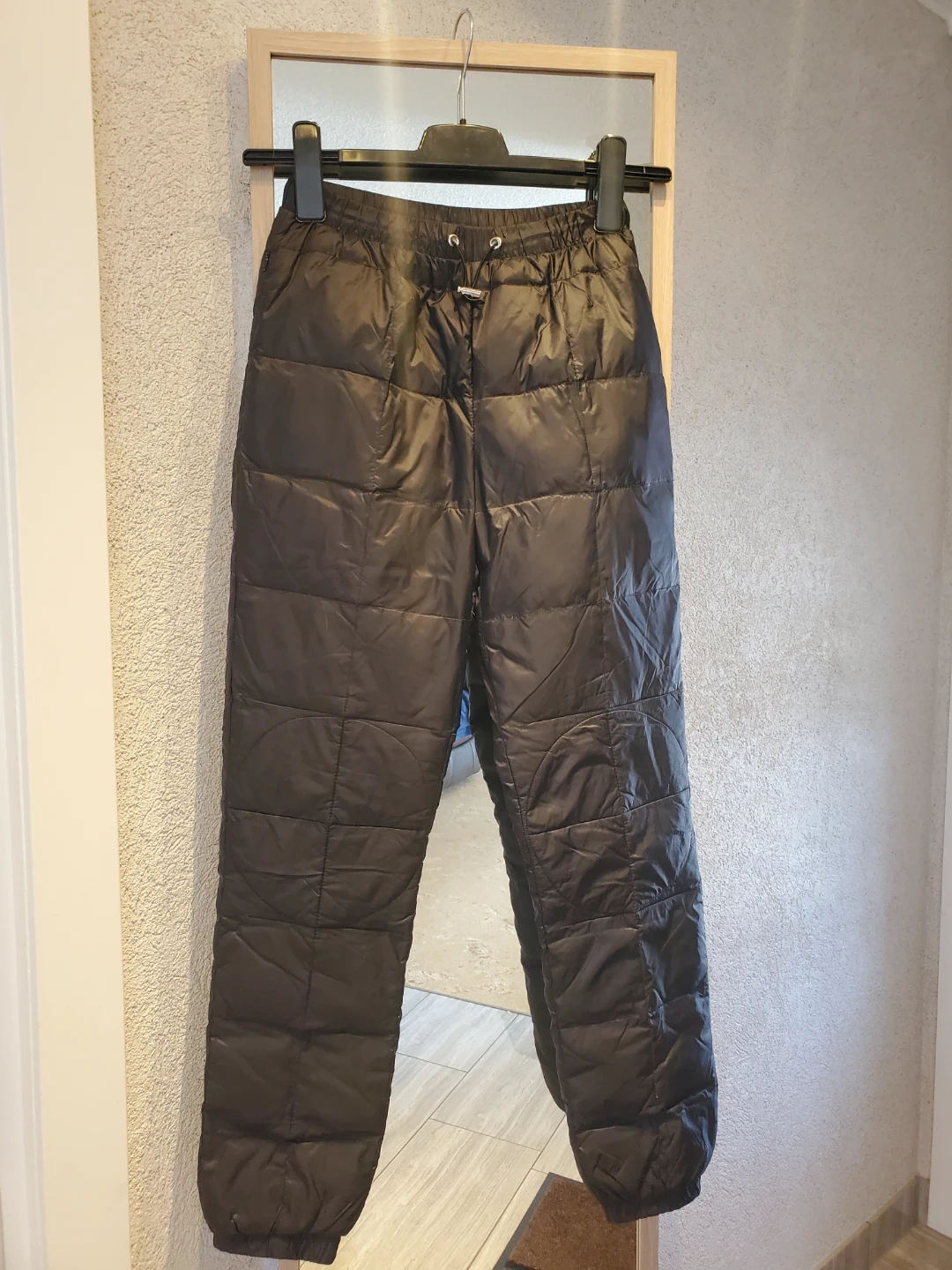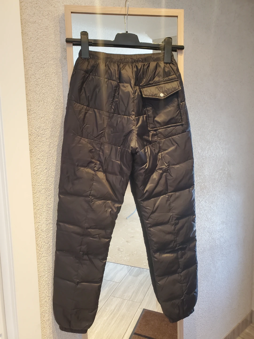 Puffer snow pants in black. Quilted design for warmth. Down filling. Elastic waistband with drawstring. One back pocket with snap closure and two zipped side pockets.