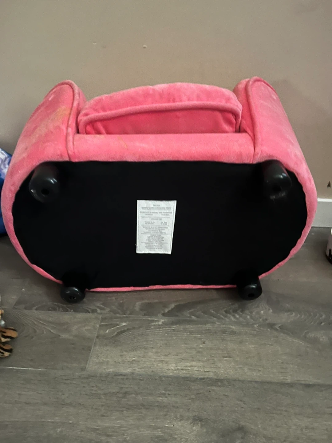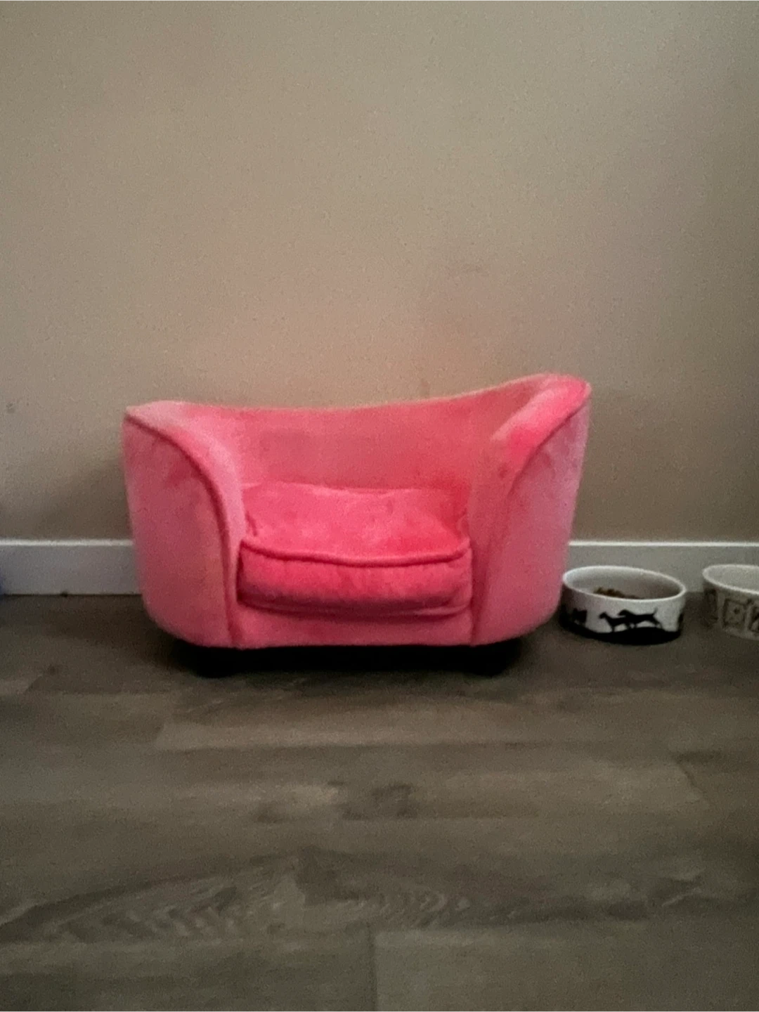 Comfy pink pet sofa. It's upholstered in a soft, plush material. Suitable for small dogs or cats. Your pet will love lounging in this adorable mini sofa! Needs some TLC cushion cover is washable-zips off