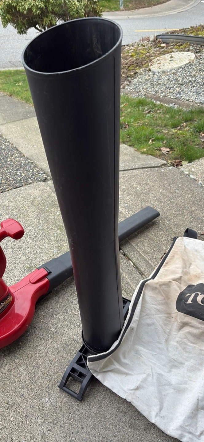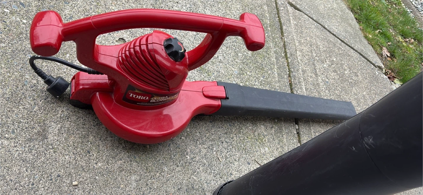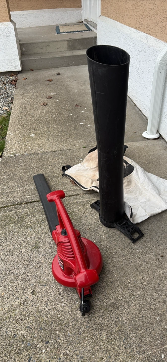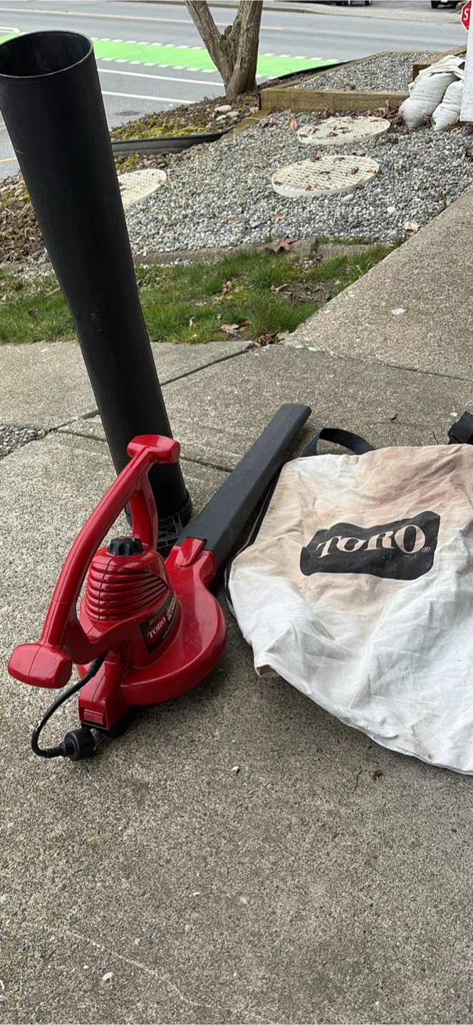 This red Toro Ultra Blower Vac is a handy tool for yard cleanup. It includes the blower tube, vacuum tube, and a Toro collection bag. It's designed for efficient leaf blowing and vacuuming.