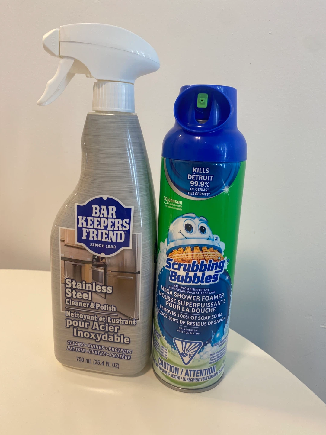 Bar Keepers Friend Stainless Steel Cleaner and Polish is 750 mL. Scrubbing Bubbles Mega Shower Foamer is a bathroom disinfectant that kills 99.9% of germs. It removes 100% of soap scum.