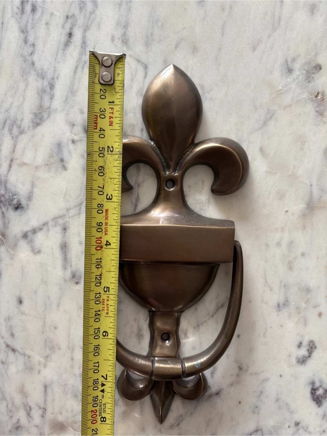 Selling a beautiful vintage bronze door knocker with a fleur-de-lis design. It's in great shape and would add a touch of elegance to any front door. The knocker measures approximately 8 inches in length.