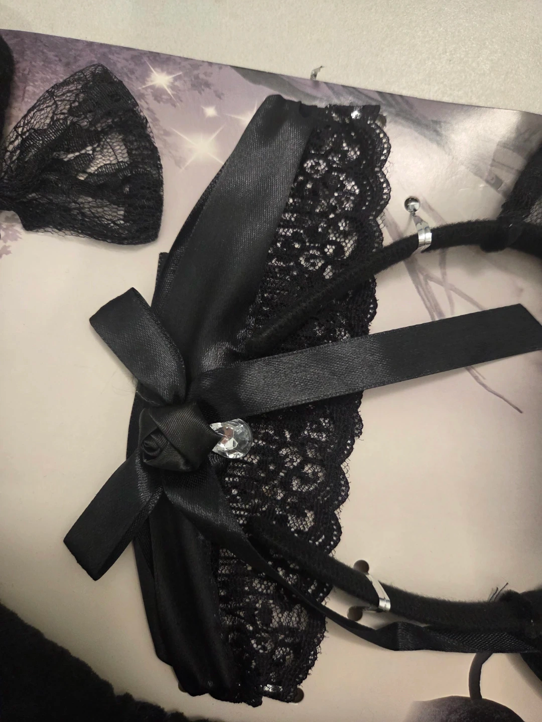 Get ready for your next costume party with this adorable Black Cat Accessory Set! It includes everything you need to complete your look: lace detailed cat ears, a matching choker (collar) with a rose detail, and a plush tail.