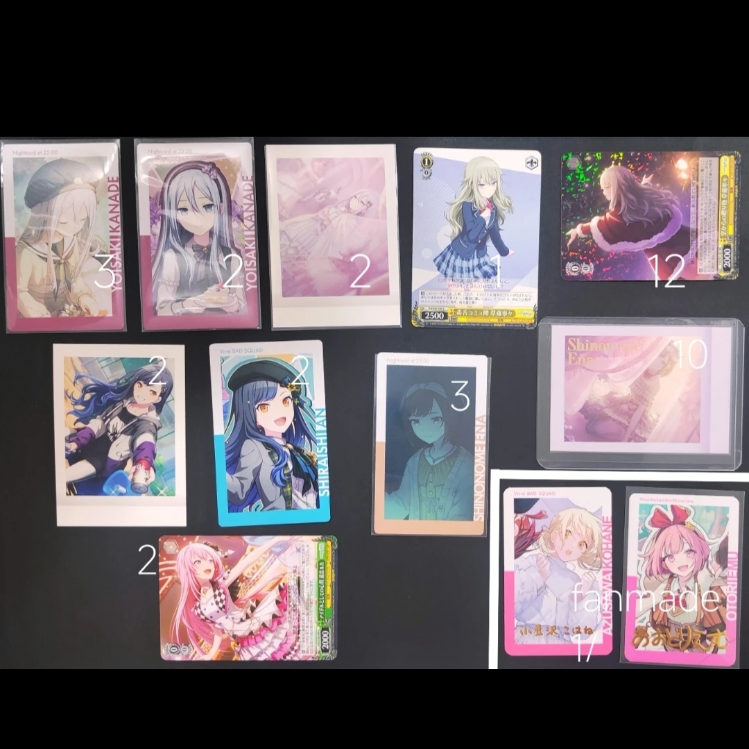 This lot includes various Project SEKAI trading cards featuring characters like Yoisaki kanade, Shiraishi An, Shinonome Ena, Azusawa Kohane. Kusanagi Nene, Ootori Emu. Selected cards are in protective sleeves.