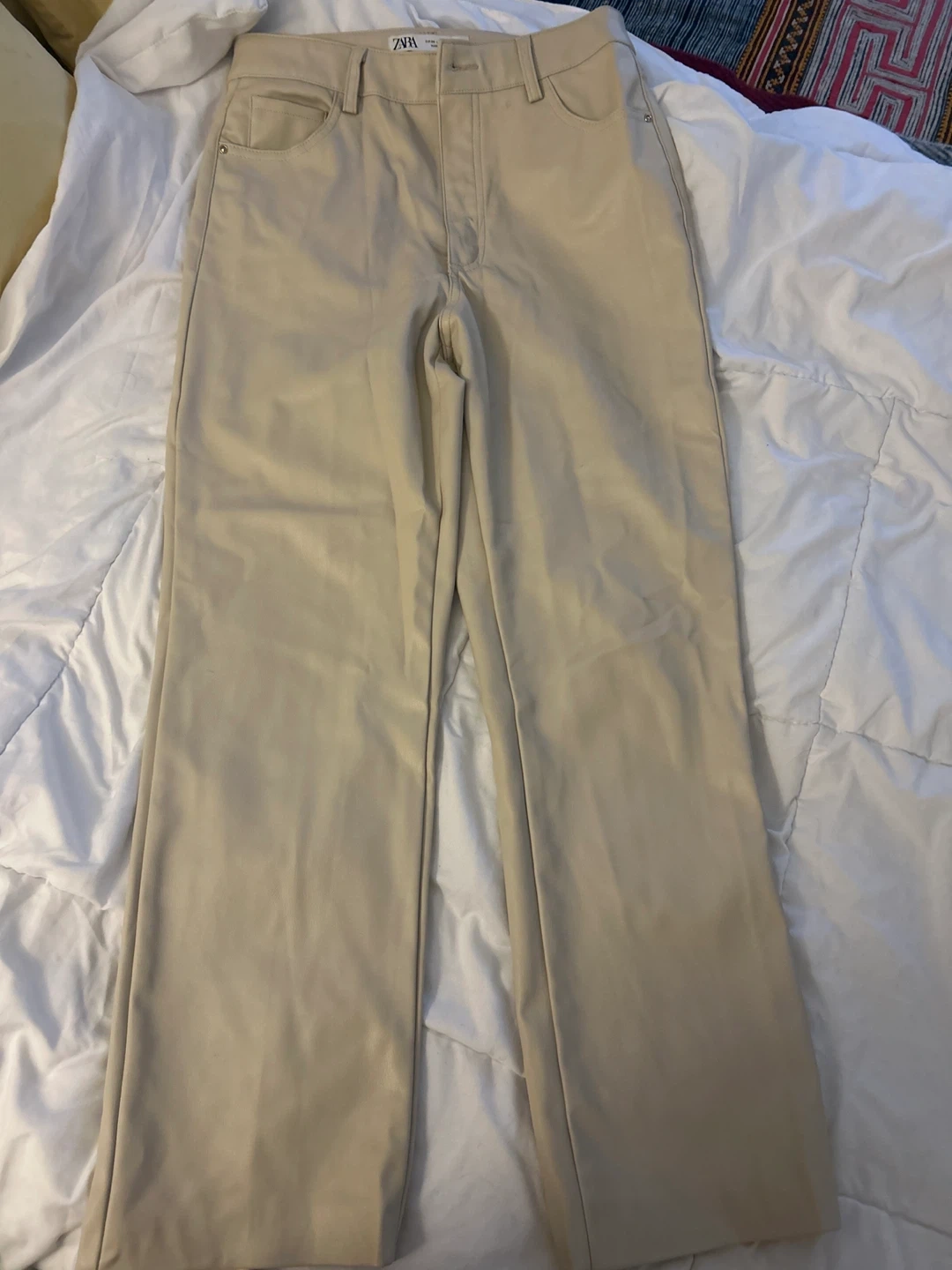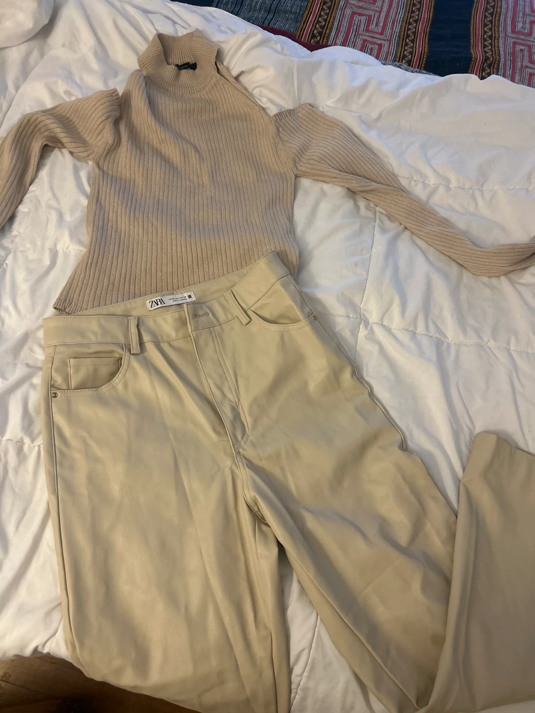 ZARA Beige Ribbed Cold Shoulder Sweater & Faux Leather Pants Set