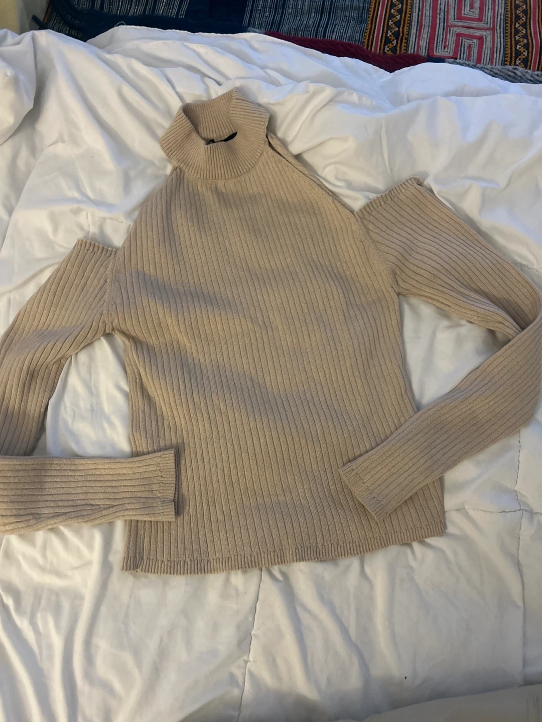 A beige ribbed knit sweater with cold shoulder cutouts. Also includes a pair of beige faux leather straight-leg pants. Both items are from ZARA.