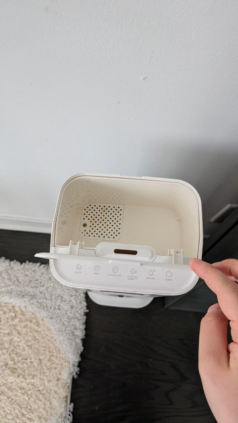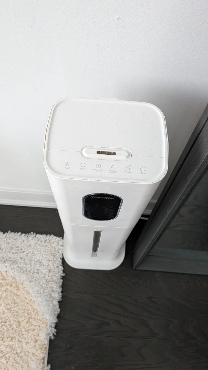 This is a white YOKEON humidifier. It has several control buttons on top including power, sleep, timer, and humidity settings. The water level is visible through a clear strip on the front.