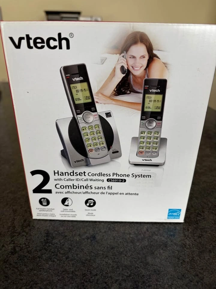 Vtech DECT 6.0 Two handsets cordless phone system with 30 name/number caller ID (with 20 call block) and 50 phonebook memory. Features call block to prevent unwanted callers, handset speakerphones with backlit keypads and displays, and intercom capability. Comes in original box.