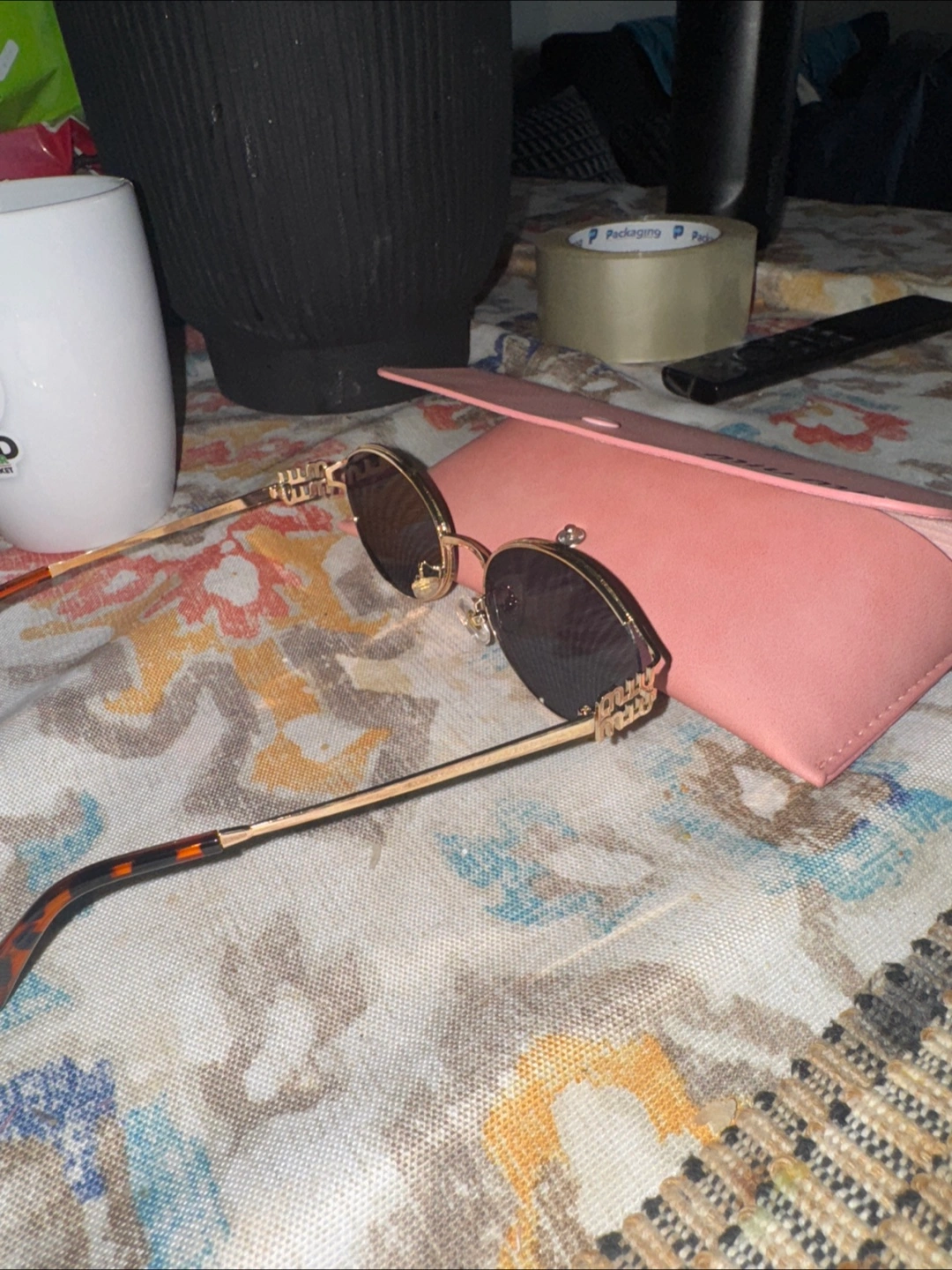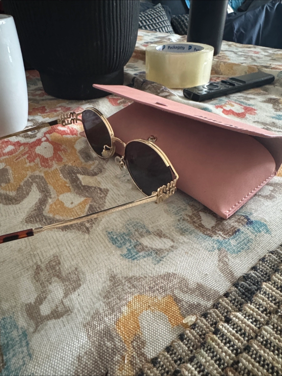 These Miu Miu sunglasses feature a gold-tone metal frame and dark lenses. They come with a pink protective case. These are a stylish accessory for sunny days!