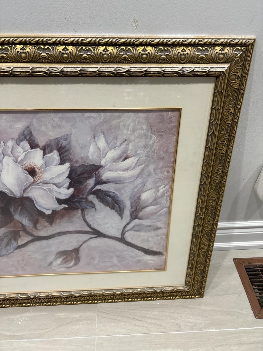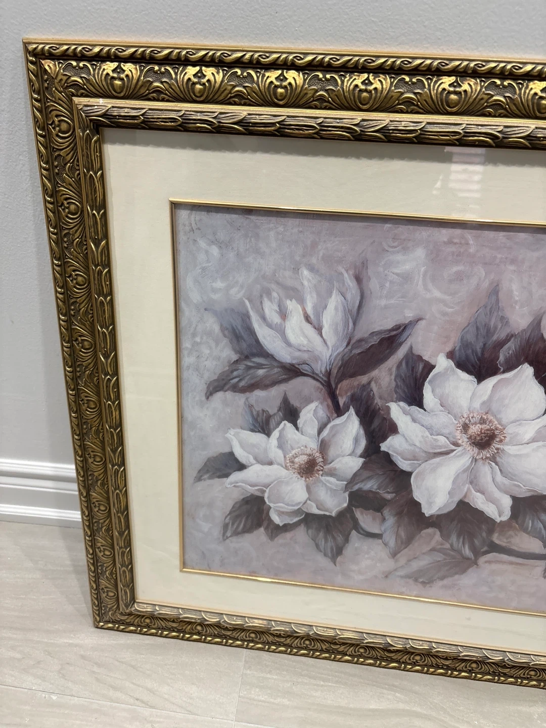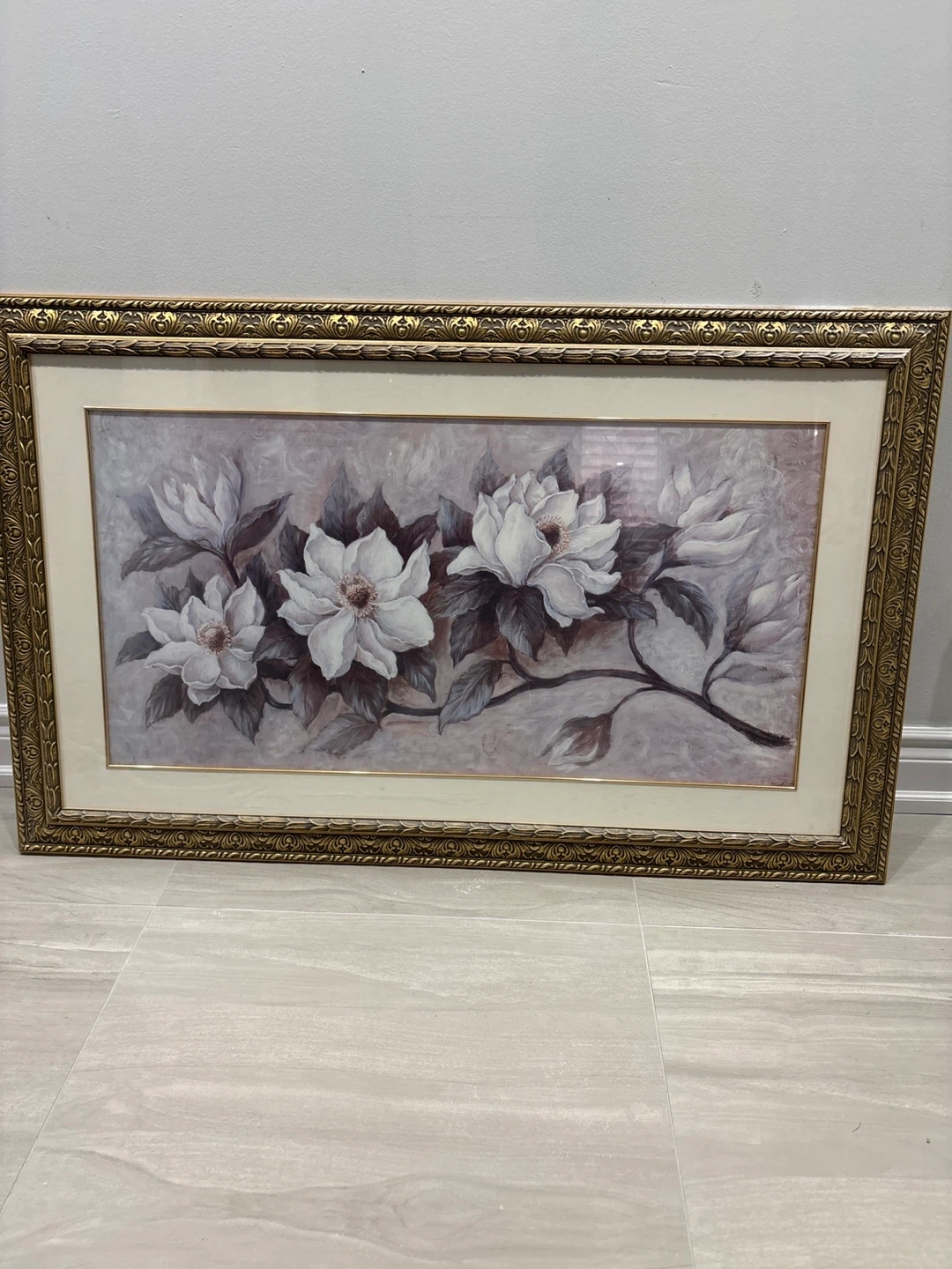 Beautiful framed wall art featuring a floral print with white magnolias. The ornate gold-toned frame adds a touch of elegance. It's a lovely decorative piece for any room. Measures approximately 1.18 metres wide by 65cm tall. Used but is good.