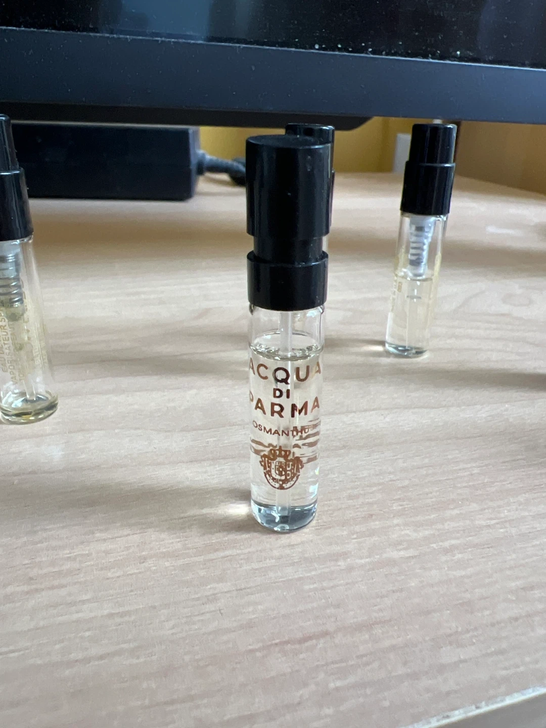 This is a sample vial of Acqua di Parma Osmanthus perfume. It's a small glass spray bottle with a black cap. Perfect for trying out a new scent!