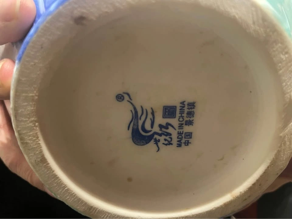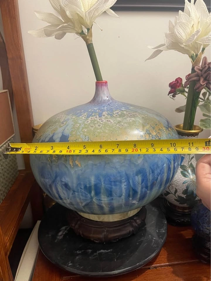 Stunning vase with a unique blue, green, and gold crystalline glaze. Comes with a wooden stand. The vase is about 11.5 inches tall and around 10.5 inches wide. Made in Jing De Zhen, China.