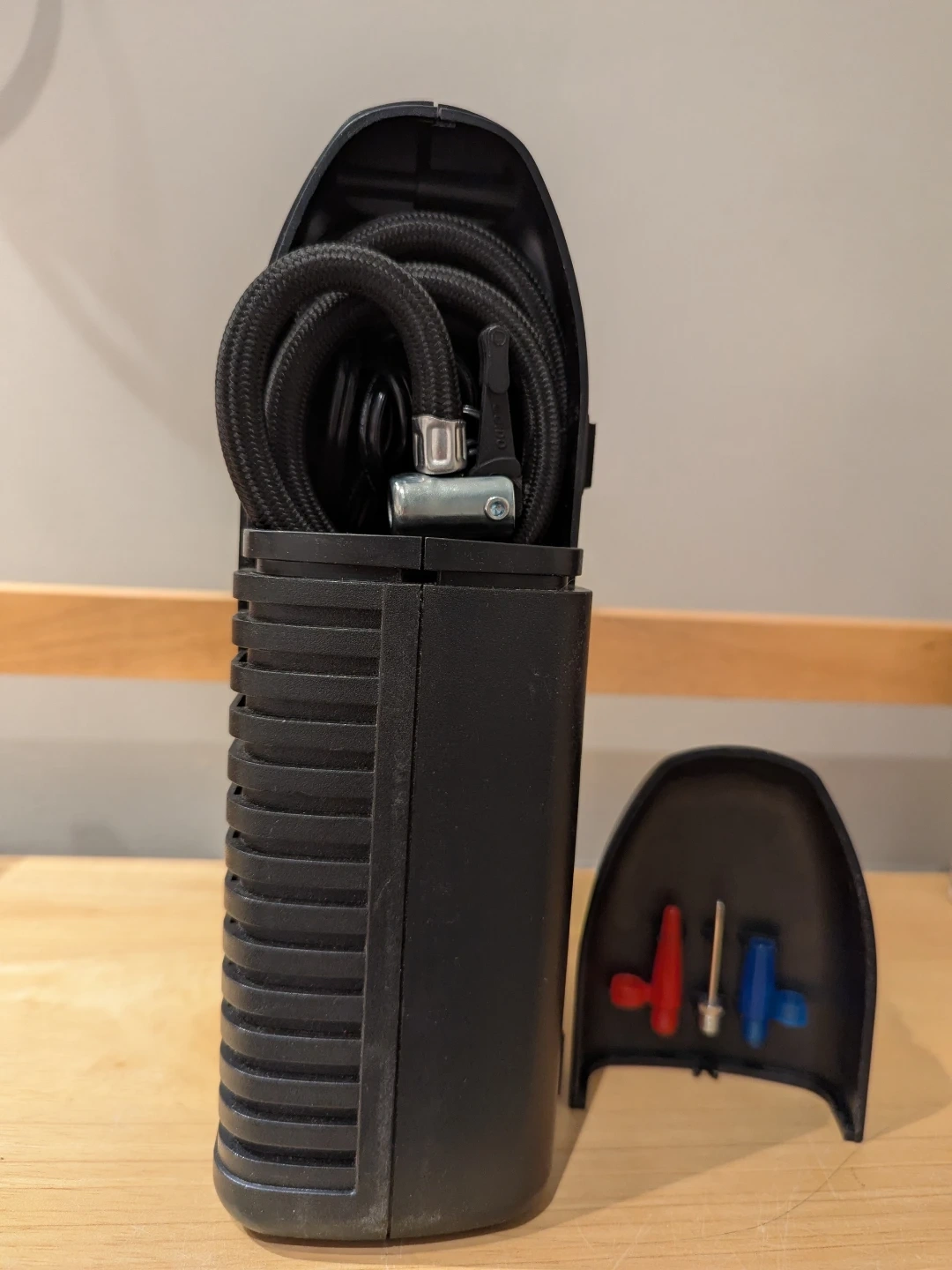 This black 250 PSI 12V air compressor with gauge is perfect for vehicle tire maintenance and inflating various items. It operates from a vehicle cigarette lighter plug. Includes adaptors for inflating tires, athletic balls, and other inflatables.