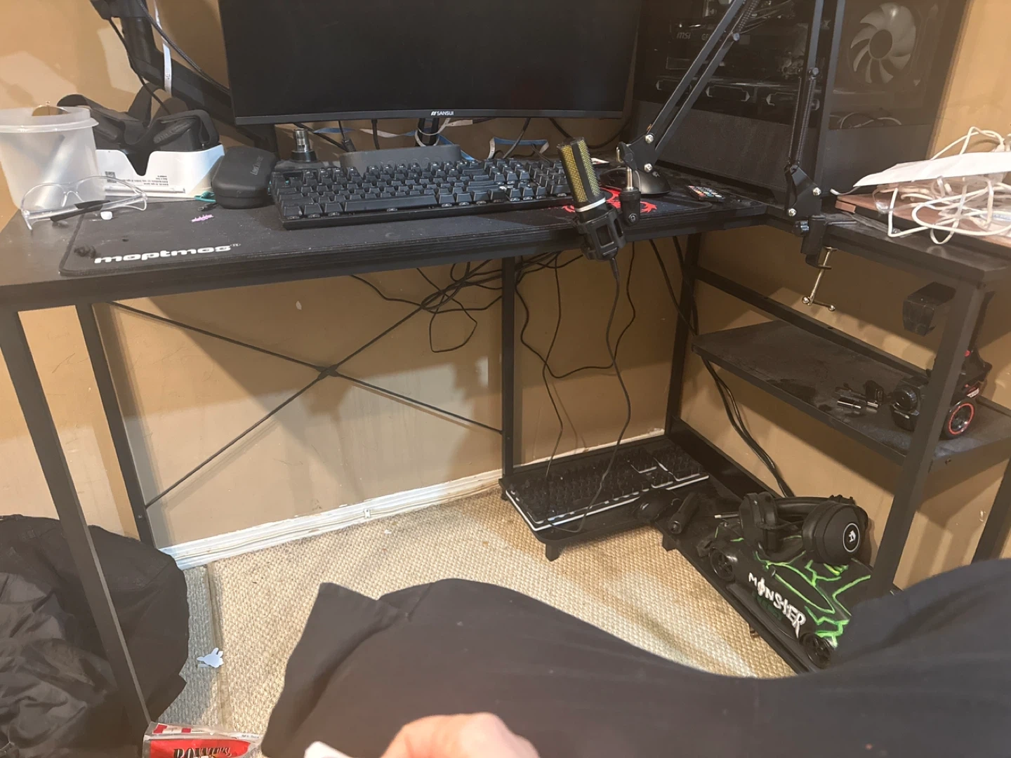 This is a black gaming desk with a metal frame. It's a corner desk with shelves for storage. It's sturdy and has ample space for your setup.