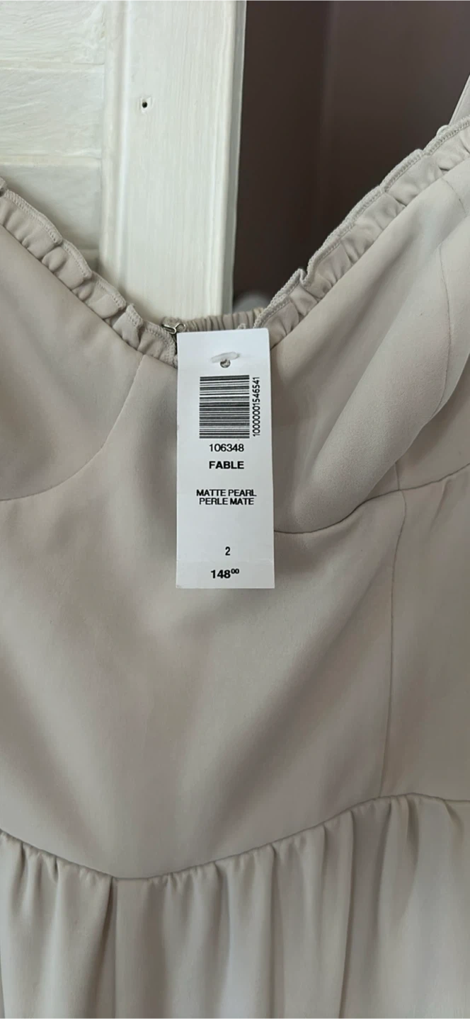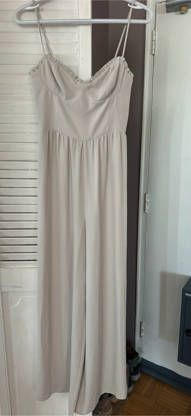 This is a Fable beige wide leg jumpsuit in size 2. It has a sweetheart neckline with ruffle trim and adjustable spaghetti straps. The fabric is a matte poly-blend.