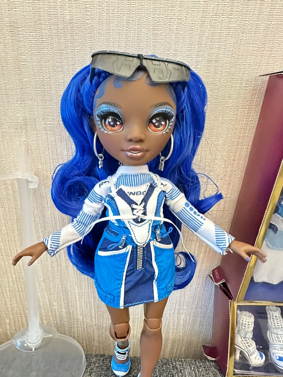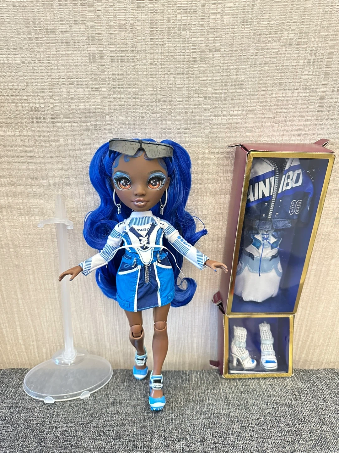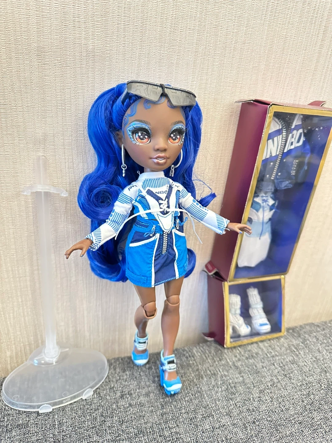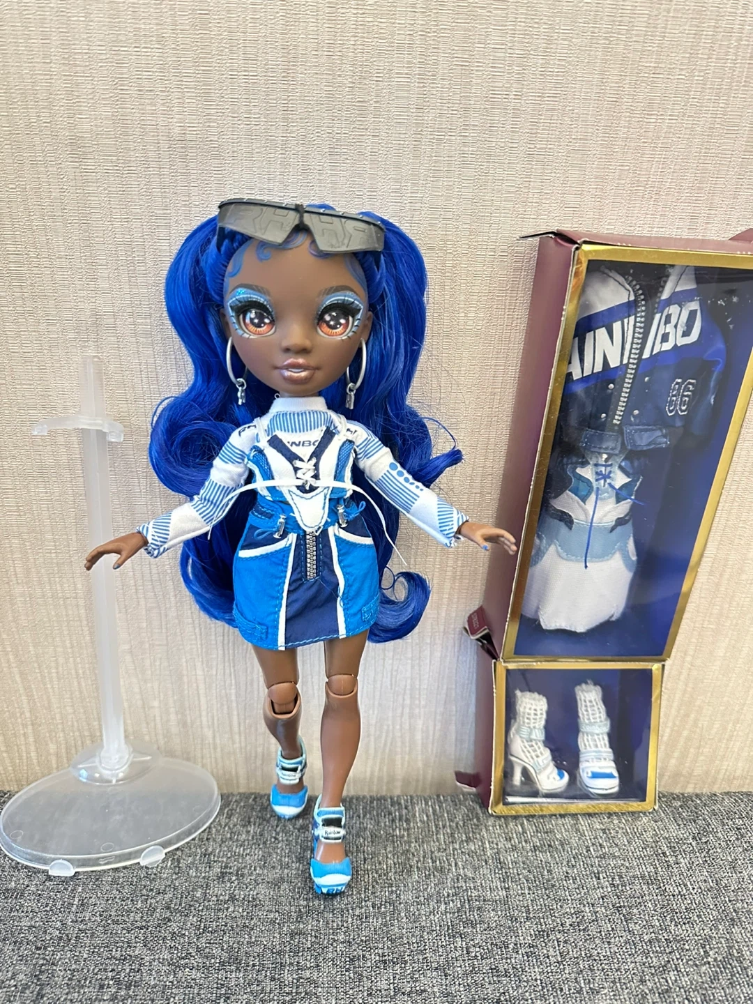 This is the Rainbow High Coco Vander doll in Cobalt Blue. She comes with her original outfit, a jacket, a skirt, and shoes. The doll features long, wavy blue hair and detailed makeup. It's a great toy for fashion doll enthusiasts!